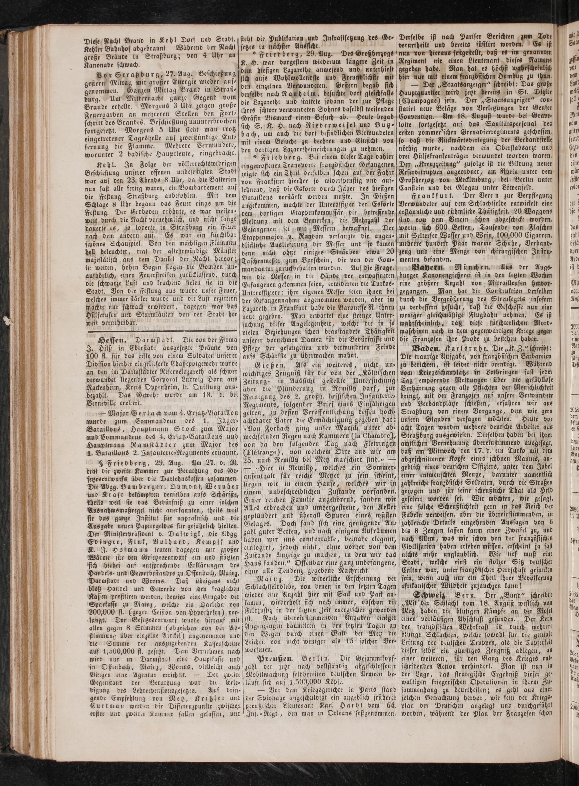 Großherzog von Mecklenburg, bei Berlin unter Canstein und bei Glogau unter Löwenfeld. Frankfurt. Der Veren zur Verpflegung Verwundeter auf dem Schlachtfelde entwickelt eine erstaunliche und rühmliche Thätigkeit. 20 Waggons sind von dem Verein schon abgeschickt worden, worin sich 600 Betten, Tausende von Flaschen mit Selterser Wasser und Wein, 100,000 Cigarren, mehrere hundert Paar warme Schuhe, Verband— zeug und eine Menge von chirurgischen Instru⸗ menten befanden. a Bayern. München. Aus der Augs⸗ burger Kanonengießerei ist in den letzten Wochen eine größere Anzahl von Mitrailleusen hervor- gegangen. Man hat die Construktion derselben durch die Vergrößerung des Streukegels insofern zu verbessern gesucht, daß die Geschosse nun eine weniger gleichmäßige Flugbahn nehmen. Es ist wahrscheinlich, daß diese fürchterlichen Mord⸗ maschinen noch in dem gegenwärtigen Kriege gegen die Franzosen ihre Probe zu bestehen haben. Baden, Karlsruhe. Die„K. Z.“ schreibt: Die traurige Aufgabe, von französischen Barbareien zu berichten, ist leider nicht beendigt. Während vom Kriegsschauplatze in Lothringen fast jeder Tag empörende Meldungen über die gefühllose Verhärtung gegen alle Pflichten der Menschlichkeit bringt, mit der Franzosen auf unsere Verwundete und Verbandplätze schießen, erfahren wir aus Straßburg von einem Vorgange, dem wir gern unsern Glauben versagen möchten. Heute vor acht Tagen wurden mehrere deutsche Arbeiter aus Straßburg ausgewiesen. Dieselben haben bei ihrer amtlichen Vernehmung übereinstimmend ausgesagt, daß am Mittwoch den 17. d. ein Turko mit dem abgeschnittenen Kopfe eines schönen Mannes, an ⸗ geblich eines deutschen Offiziers, unter dem Jubel einer entmenschten Menge, darunter namentlich zahlreiche französische Soldaten, durch die Straßen gezogen und für seine scheußliche That als Held gefeiert worden sei. Wir möchten, wie gesagt, eine solche Scheußlichkeit gern in das Reich der Fabeln verweisen, aber die übereinstimmenden, in zahlreiche Details eingehenden Aussagen von 6 bis 8 Zeugen lassen kaum einen Zweifel zu, und nach Allem, was wir schon von der französischen Civilisation haben erleben müssen, erscheint ja fast nichts mehr unglaublich. Wie tief muß eine Stadt, welche einst ein stolzer Sitz deutscher Cultur war, unter französischer Herrschaft gesunken sein, wenn auch nur ein Theil ihrer Bevölkerung afrikanischer Wildheit zujauchzen kann! Schweiz. Bern. Der„Bund“ schreibt: „Mit der Schlacht vom 18. August westlich von Metz haben die blutigen Kämpfe an der Mosel einen vorläufigen Abschluß gefunden. Der Kern der französischen Wehrkraft ist durch mehrere blutige Schlachten, welche sowohl für die geniale Leitung der deutschen Truppen, als die Tapferkeit dieser selbst ein günstiges Zeugniß ablegen, an einer weiteren, für den Gang des Krieges ent⸗ scheidenden Action verhindert. Man ist nun in der Lage, das strategische Ergebniß dieser ge— waltigen kriegerischen Operationen in ihrem Zu— sammenhang zu beurtheilen; es geht aus einer solchen Betrachtung hervor, wie fein der Kriegs plan der Deutschen angelegt und durchgeführt worden, während der Plan der Franzosen schon