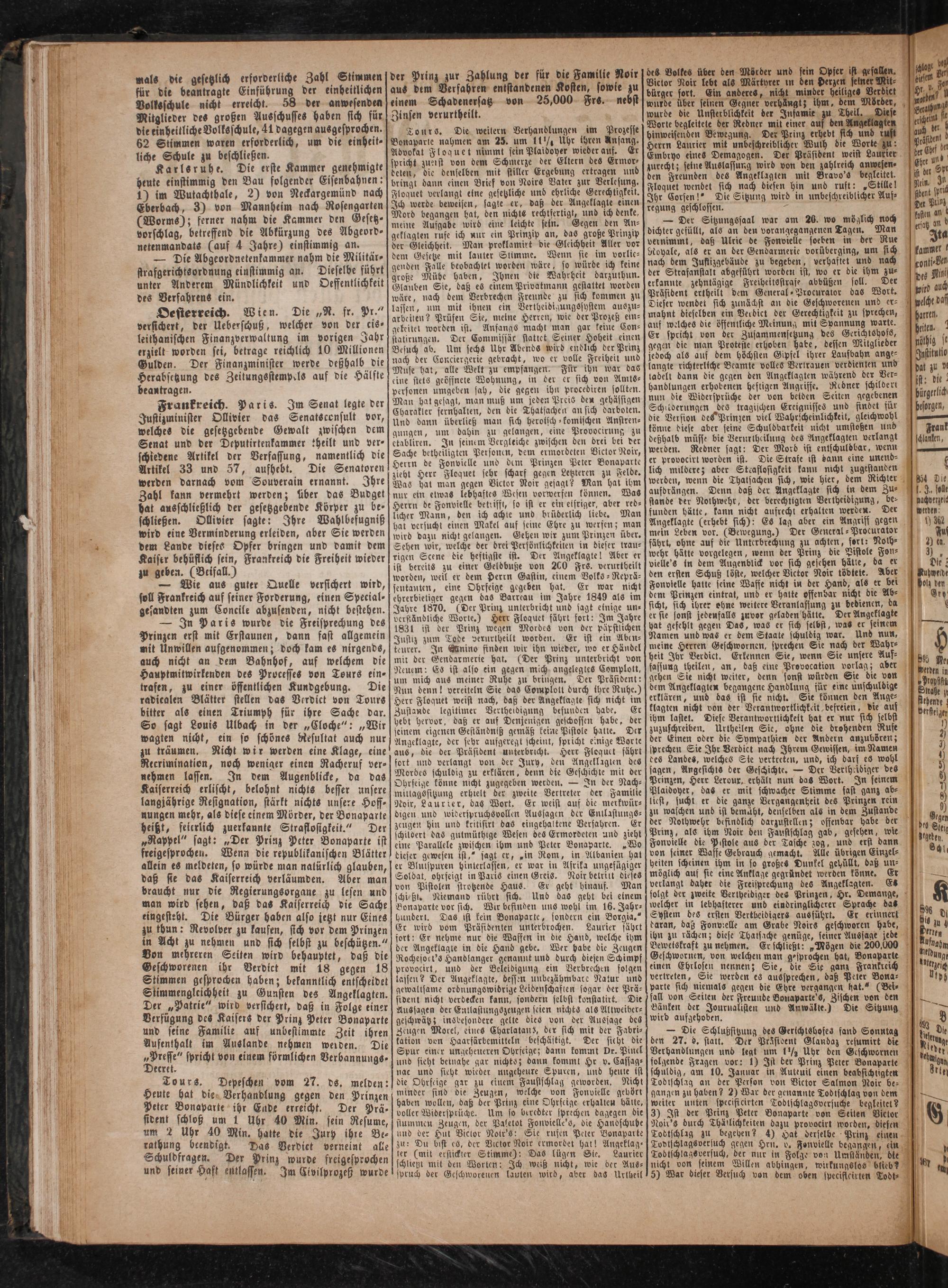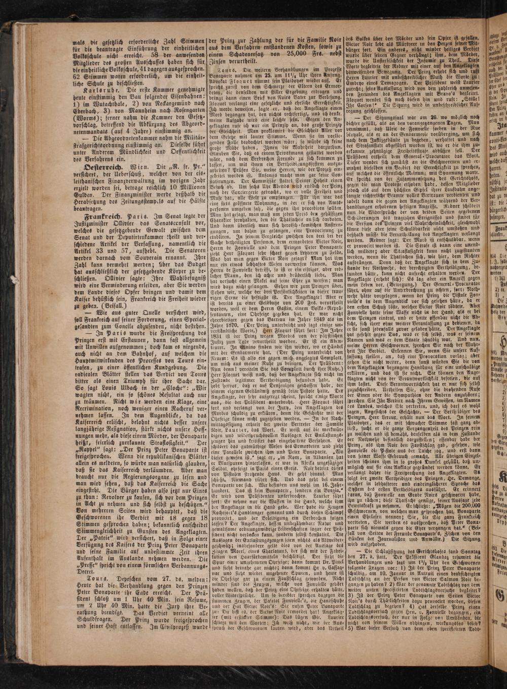 — Der Sitzungssaal war am 26. wo möglich noch dichter gefüllt, als an den vorangegangenen Tagen. Man vernimmt, daß Ulric de Fonvielle soeben in der Rue Royale, als er an der Gendarmerie vorüberging, um sich nach dem Justizgebäude zu begeben, verhaftet und nach der Strafanstalt abgeführt worden ist, wo er die ihm zu⸗ erkannte zehntägige Freiheitsstrafe abbüßen soll. Der Präsident ertheilt dem General ⸗Procurator das Wort. Dieser wendet sich zunächst an die Geschworenen und er⸗ mahnt dieselben ein Verdict der Gerechtigkeit zu sprechen, auf welches die öffentliche Meinung mit Spannung warte. Er spricht von der Zusammensetzung des Gerichtshofs, gegen die man Protesse erhoben habe, dessen Mitglieder jedoch als auf dem höchsten Gipfel ihrer Laufbahn ange⸗ langte richterliche Beamte volles Vertrauen verdienten und tadelt dann die gegen den Angeklagten während der Ver⸗ handlungen erhobenen heftigen Angriffe. Redner schildert nun die Widersprüche der von beiden Seiten gegebenen Schilderungen des tragischen Ereignisses und findet fur die Version des Prinzen viel Wahrscheinlichkeit, gleichwohl tönne diese aber seine Schuldbarkeit nicht umstoßen und deßhalb müsse bie Verurtheilung des Angeklagten verlangt werden. Redner sagt: Der Mord ist entschuldbar, wenn er provocirt worden ist. Die Strafe ist dann eine unend⸗ lich mildere; aber Staaflosigkeit kann nicht zugestanden