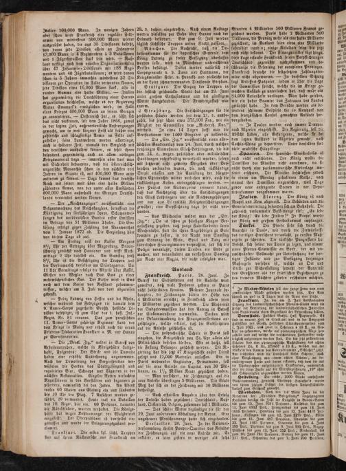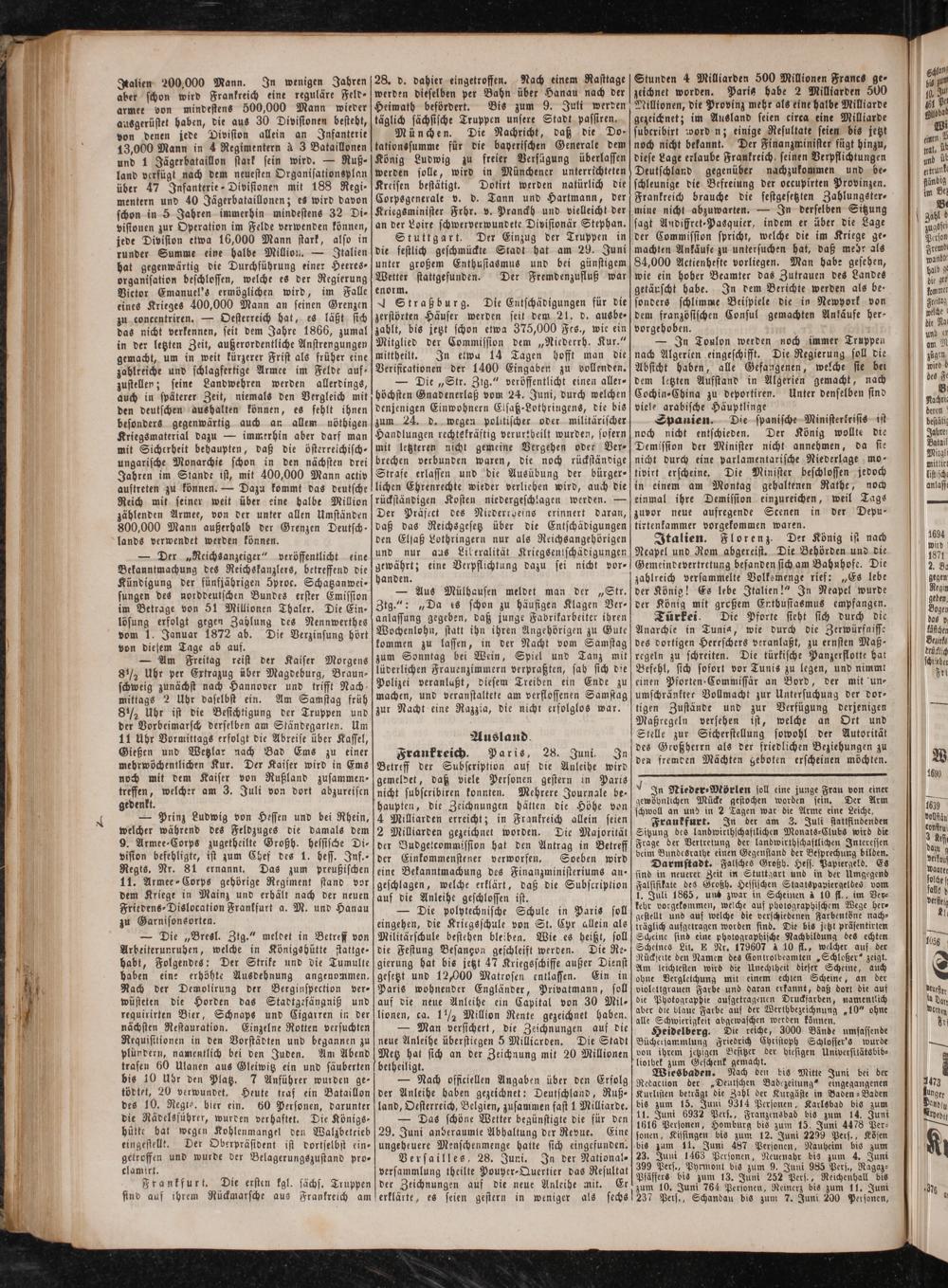 Frankreich. Paris, 28. Juni. In Betreff der Subscription auf die Anleihe wird gemeldet, daß viele Personen gestern in Paris nicht subscribiren konnten. Mehrere Journale be haupten, die Zeichnungen hätten die Höhe von 4 Milliarden erreicht; in Frankreich allein seien 2 Milliarden gezeichnet worden. Die Majorität der Budgetcommission hat den Antrag in Betreff der Einkommenstener verworfen. Soeben wird eine Bekanntmachung des Finanzministeriums an- geschlagen, welche erklärt, daß die Subscription auf die Anleihe geschlossen ist.