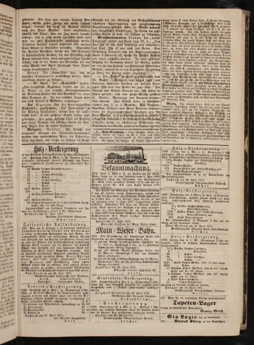 fang der Versteigerung präcis 9 Uhr Vormittags. Wickstadt den 27. April 1871. Gräfliche Oberförsterei Assenheim. Schal las.
