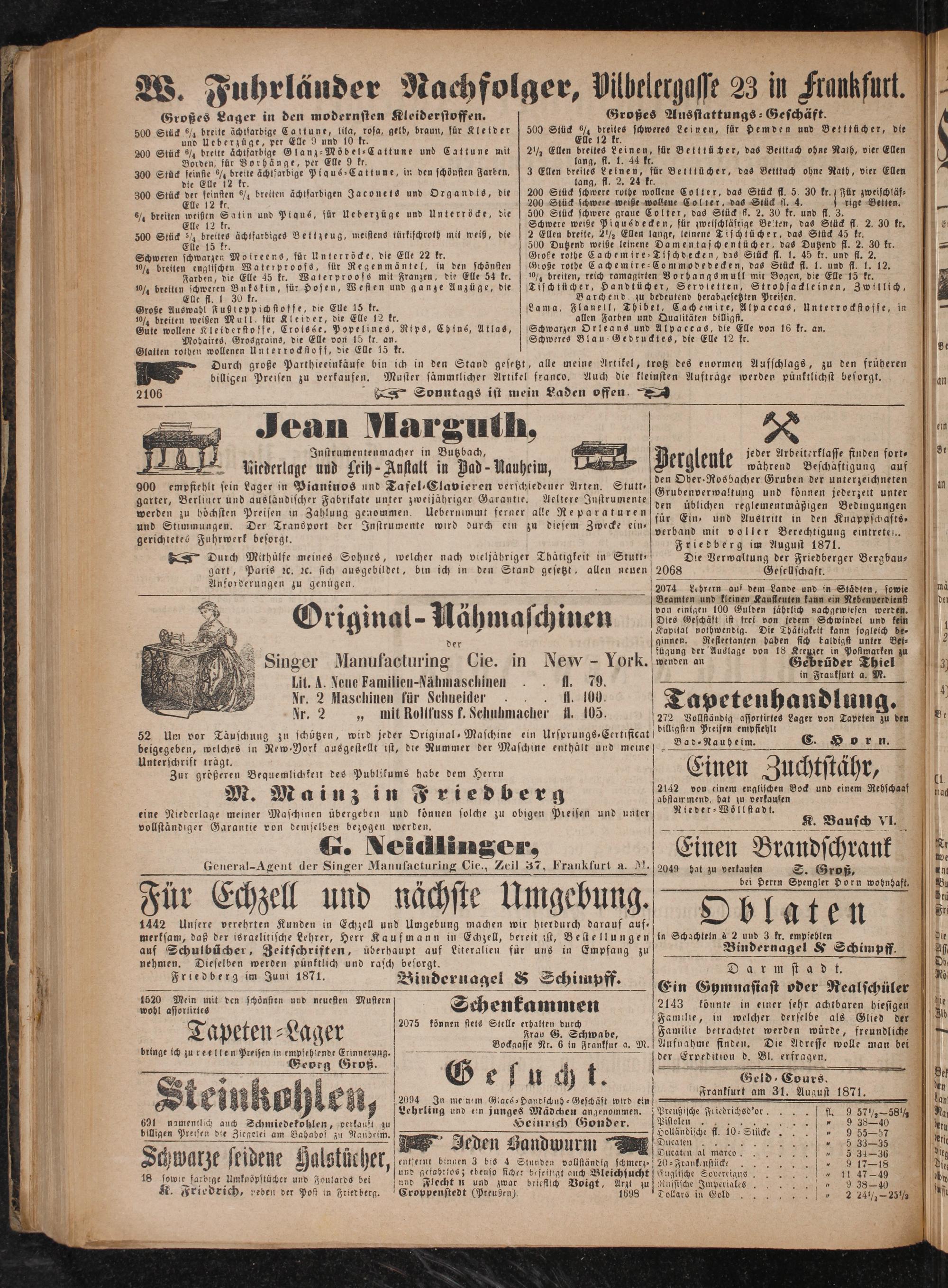 Geld Cours. Frankfurt am 31. August 1871. Preußische Friedrichsd'or... fl.