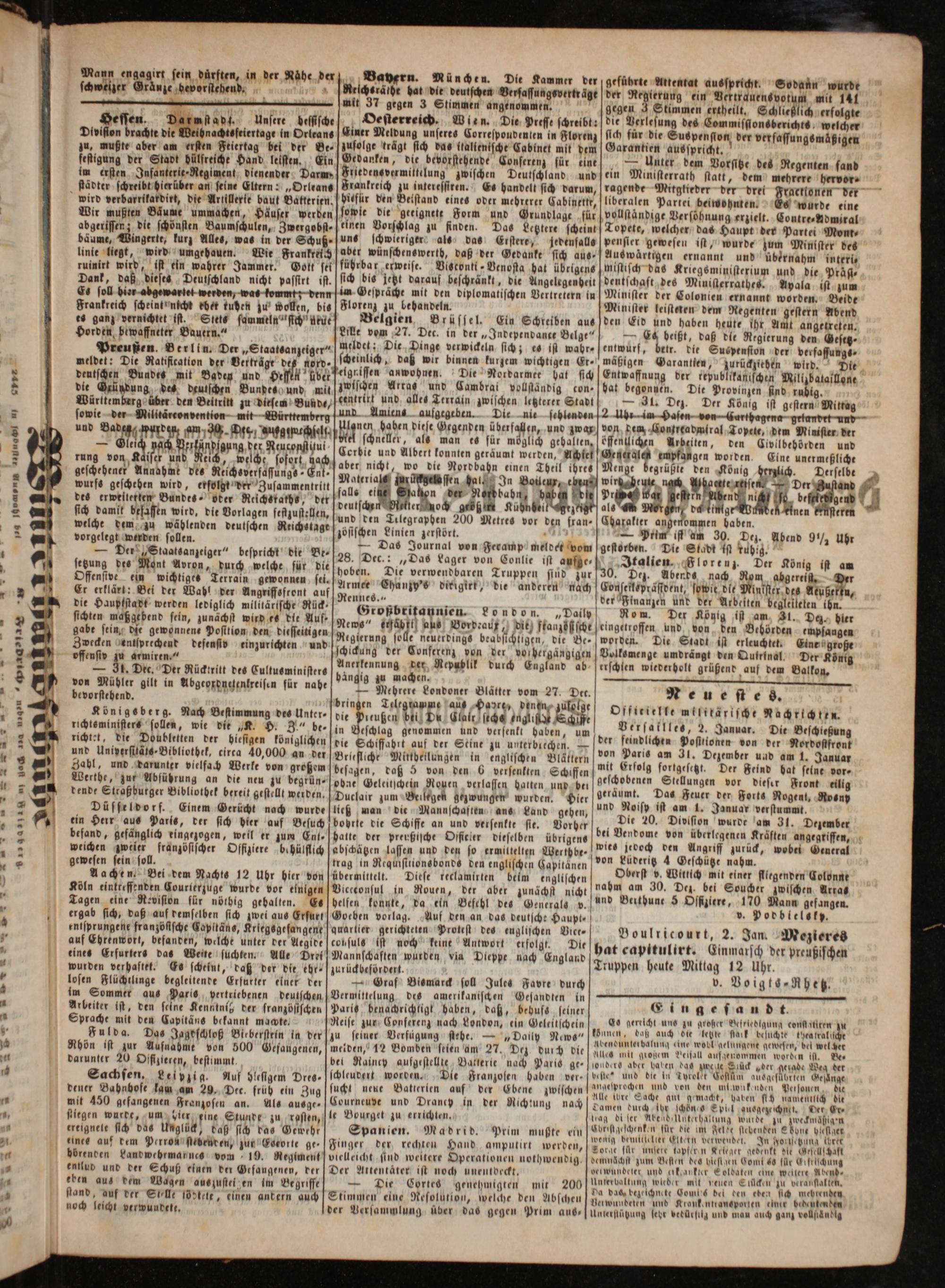 Boulricourt, 2. Jan. Mezieres hat capitulirt. Einmarsch der preußischen Truppen heute Mittag 12 Uhr.