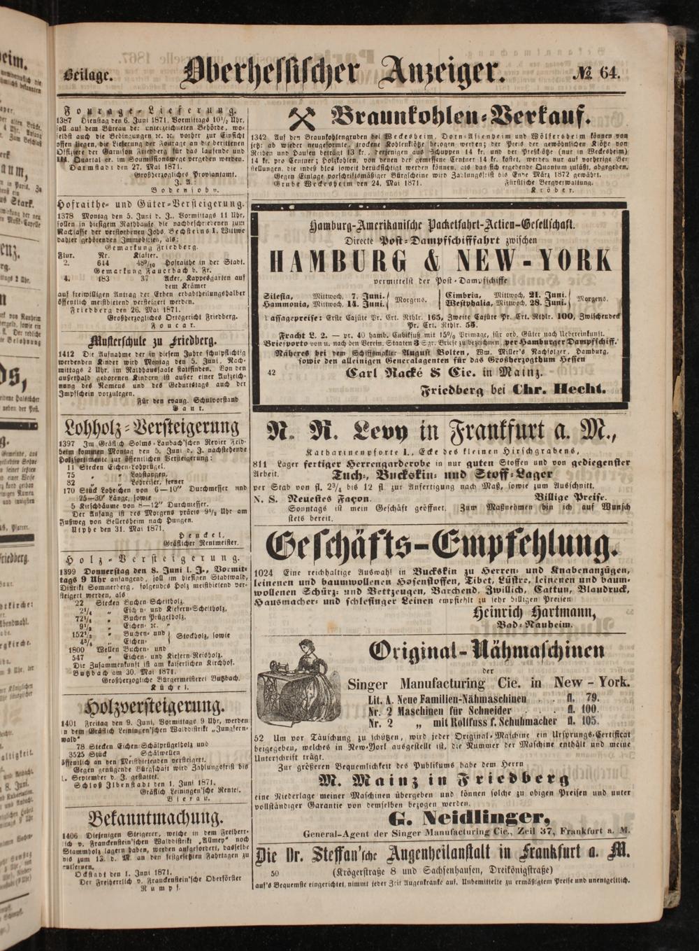 Näheres bei dem Schlffsmakler August Bolten, Wm. Miller's Nachfolger, Hamburg, sowie den alleinigen Generalagenten für das Großherzogthum Hessen