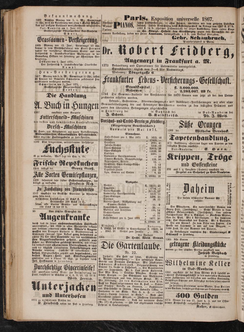 Einnahme. Kasse⸗Bestand pro 1. Mai 1871 fl. 5635. 46 Wechsel„ 17439.— Depositen„ 2890. 41 Inkasso⸗Wechsel„ 3259. 43 Conto⸗Corrente„ 22666. 26 Spar⸗Einlagen„ 11636. 30 Darlehen„ 5500.— Auswärtige Correspondenten 1— 28 Stamm⸗Antheile, Monatsbeiträge„ 126. 50 Reservefonds, Beitritt 5 15.— Utensilien, Spar⸗Einlage⸗Bücher 5 2 12 Wechsel⸗Zinsen 93 448,7 Depositen-Zinsen le Agio, Gewinn auf Sorten l. 8. 53 fl. 69860. 39