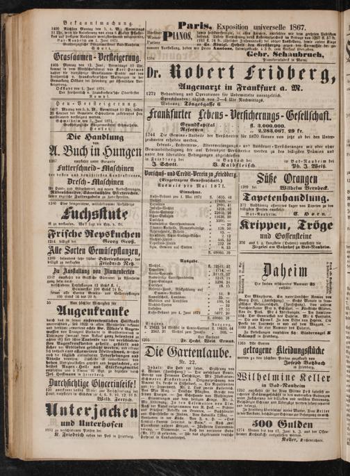 cher vor Erblinden geschützt worden, und erfreut sich deshalb eines allgemeinen Weltruhmes, welches auch die täglich einlaufenden Loberhebungen und Atteste beweisen. Dasselbe ift concessionirt, von hohen Medizinalstellen geprüft und begutachtet, als bestes Augen ⸗Heil⸗ und Stärkungsmittel empfohlen und à Flacon 10 Sgr. zu beziehen durch Jos. Hoffmann in Friedberg.
