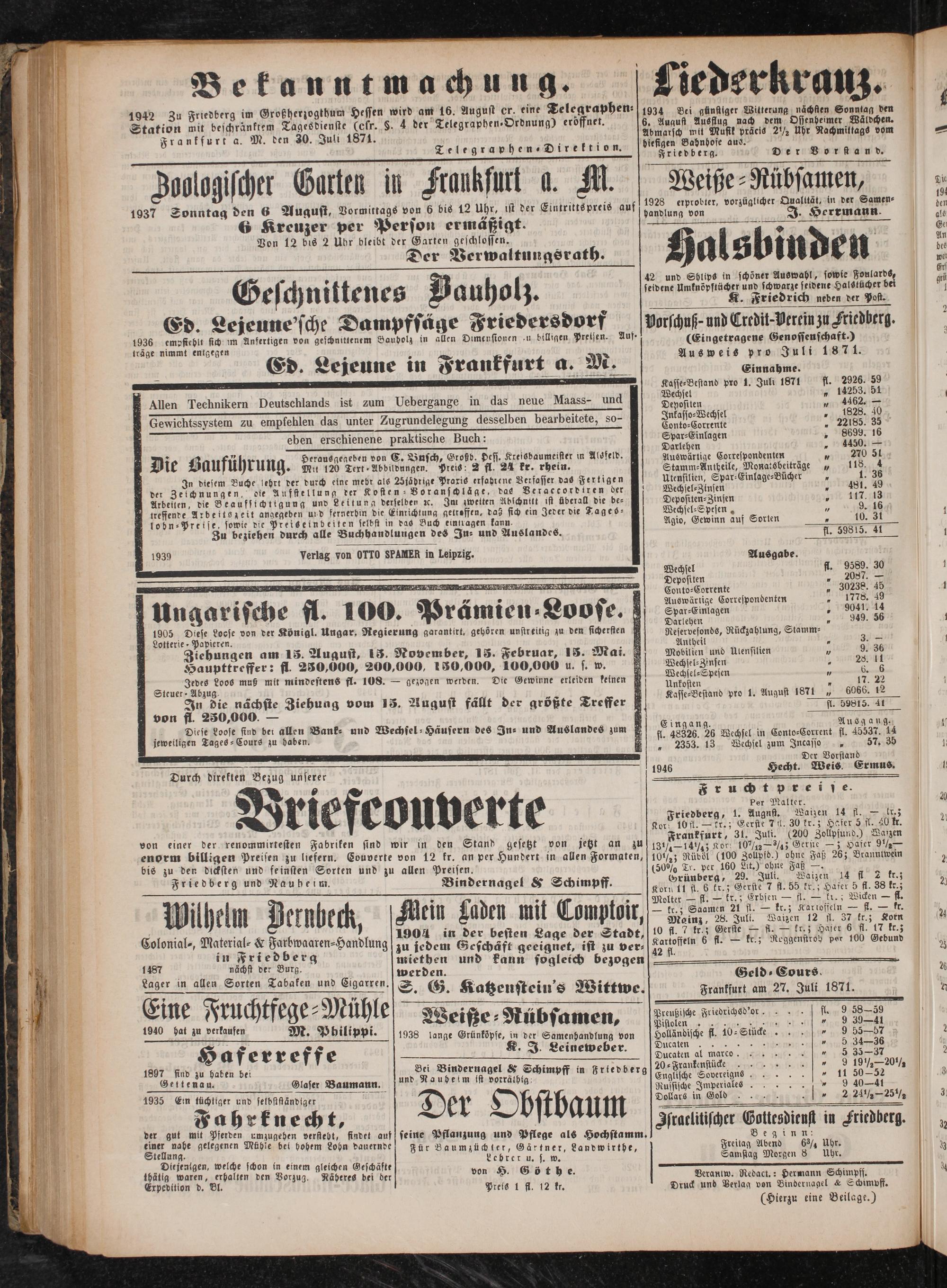 Ausweis pro Juli 1871. Einnahme. Kasse⸗Bestand pro 1. Juli 1871 fl. 2926. 59 Wechsel„ 14253. 51 Depositen„ 4462.— Inkasso⸗Wechsel„ 1828. 40 Conto⸗Corrente„ 22185. 35 Spar⸗Einlagen„ 8699. 16 Darlehen„ 4450.— Auswärtige Correspondenten* 270 51 Stamm⸗Antheile, Monatsbeiträge„ 118. 4 Utensilien, Spar⸗Einlage⸗Bücher 9 1. 36 Wechsel⸗Zinsen„ 481. 49 Depositen⸗Zinsen 5 117. 13 Wechsel⸗Spesen„ 5 9. 16 Agio, Gewinn auf Sorten 85 10. 31 fl. 59815. 41 Ausgabe. Wechsel fl. 9589. 30 Depositen„ Conto⸗Corrente„ 30238. 45 Auswärtige Correspondenten„ 1778. 49 Spar⸗Einlagen„ 9041. 14 Darlehen 5 949. 56 Reservefonds, Rückzahlung, Stamm⸗