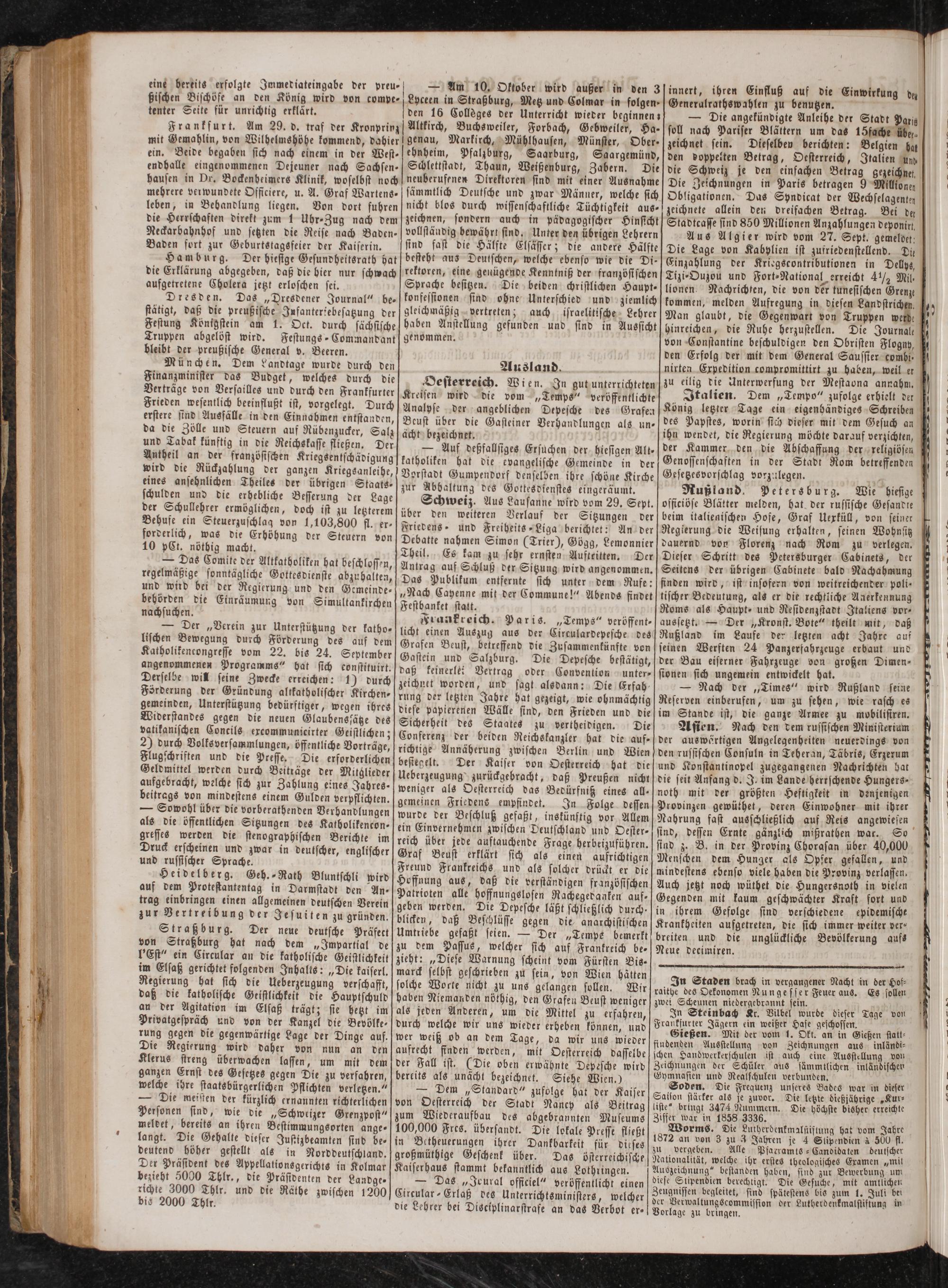 Straßburg. Der neue deutsche Präfett von Straßburg hat nach dem„Impartlal de l'Est“ ein Circular an die katholische Geistlichkeit im Elsaß gerichtet folgenden Inhalts:„Die kaiserl. Regierung hat sich die Ueberzeugung verschafft, daß die katholische Geistlichkeit die Hauptschuld an der Agitation im Elsaß trägt; sie hetzt im Privatgespräch und von der Kanzel die Bevölke- rung gegen die gegenwärtige Lage der Dinge auf. Die Regierung wird daher von nun an den Klerus streng überwachen lassen, um mit dem ganzen Ernst des Gesetzes gegen Die zu verfahren, welche ihre staatsbürgerlichen Pflichten verletzen.“ — Die meisten der kürzlich ernannten richterlichen Personen sind, wie die„Schweizer Grenzpost“ meldet, bereits an ihren Bestimmungsorten ange⸗ langt. Die Gehalte dieser Justizbeamten sind be— deutend höher gestellt als in Norddeutschland. Der Präsident des Appellationsgerichts in Kolmar bezieht 5000 Thlr., die Präsidenten der Landge⸗ richte 3000 Thlr. und die Räthe zwischen 1200 bis 2000 Thlr.
