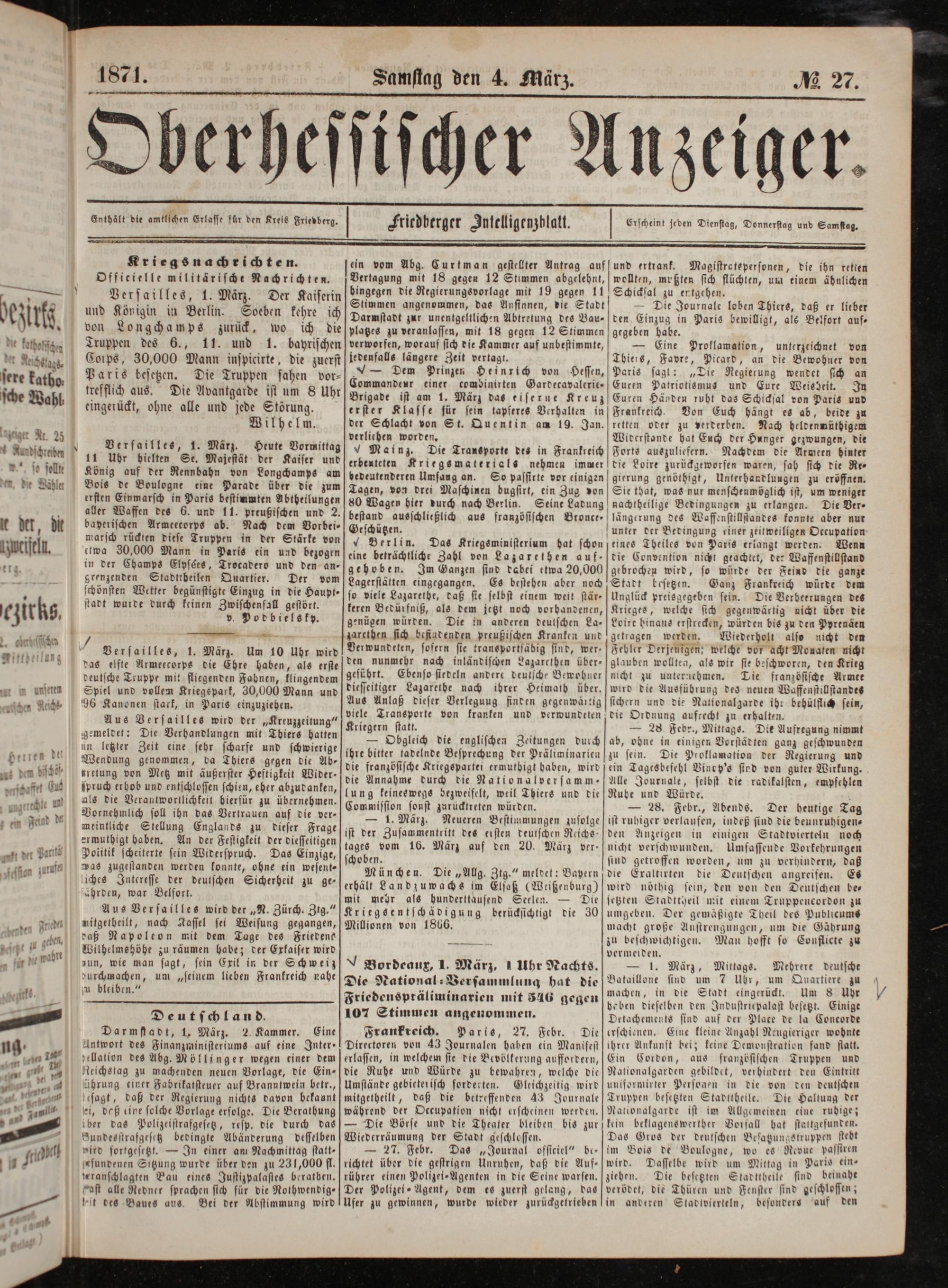 Aus Versailles wird der„Kreuzzeitung“ gemeldet: Die Verhandlungen mit Thiers hatten un letzter Zeit eine sehr scharfe und schwierige Wendung genommen, da Thiers gegen die Ab— tretung von Metz mit äußerster Heftigkeit Wider— spruch erhob und entschlossen schien, eher abzudanken, als die Verantwortlichkeit bierfür zu übernehmen. Vornehmlich soll ihn das Vertrauen auf die ver— meintliche Stellung Englands zu dieser Frage ermuthigt haben. An der Festigkeit der diesseitigen Politik scheiterte sein Widerspruch. Das Einzige, was zugestanden werden konnte, ohne ein wesent— iches Interesse der deutschen Sicherheit zu ge— ährden, war Belfort.