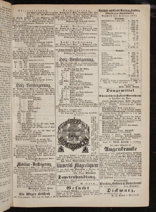 „ 15 We e e det 0 3 N 7 2 2 „ ne Edict ba n. Versteigerun g. Vorschuß- und Credit-Perein zu Friedberg. 0 duden 9 Das Sckuldenwesen des peln rich 495 Montag den 6. März, Vormittags 9 Uhr, wird dan eln Aer IV. von Münzenberg 12 7. a e e fort⸗ 1. r . N etreffend. gesetzt un ommen Bettwerk, eißzeug, Kleidung, us weis pro ebruar 8 1 W. u 9 Heinrich Löschborn IV. von Münzendera bat] Gold, Süber und Taschenuhren zum Aus gebot. 9 ö e, eee term 10. d. M. unter Zustimmung seiner Ebefrau Friedberg den 3. März 1871. Einnahme. de dein ind Schwiegermutter, der Wütwe des Delnr. Gorr IV., Groß herzogliches Ortsgericht Friedberg. Kasse⸗Bestand pro 1. Febr. 1871 fl. 4994. 39 de S, et seinen gerichtsbekannten Gläubigern ein Arran Fo uc ar. Wechsel 1 3376. 6 der Ger, Slang sment adgeschlossen.—* r Depositen„ 2080.— Na beigen Unter Geslattung der Acteneinficht auf unsrem Actuarsat Frucht ⸗Versteigerung. Ink osso⸗Wechsel„ 1830. 48 rang, verden die unbekannten und die zu dem Vergleichs- 497 Dienstag den 7. März l. J., Nachmittags 2 Uhr, Conto-Corrente„25565. 13 na n ils tmin geladenen, aber nicht erschienenen Gläubiger des werden von den Frochtvorröthen des blesigen Armen— Spar⸗Einlagen„ 5800. 35 Ainnter 8* einrich Loͤschborn IV. aufgefordert, ibre etwaigen Ein fende 100 Matter Korn Darlchen„ 2130.— K birrg,* wendungen gegen dieses Arrangement sogew 9 innerhalb auf blefigem Ratbbause öffentlich melstbtetend versteigert. Stamm⸗Antbeile, Monatsbeiträge„ 92. 30 8 Wochen, vom ersten Erscheinen dieses in öffentlichen Friedberg den 3. März 1871. Reservesonds, Beitritt 5 12.— — dagen deranz klättern, geltend zu machen, als sonst das Arrangement Großherzogliche Bürgermeisterei Friedberg. 1 Jahresbeiträge 3 1.17 Dein dag da, arichllich bestätigt end volllogen werden wird. F o ue a r. Wechsel⸗Zinsen„ 19 gan ee Bus bach den 16. Fedtuar 1871 f f Depesiuen⸗Zinsen 8 56. 31 0 0 fech Großberzogliches Landgericht Butzbach. F r u ch t- Ver st e i gerung. Mobilen und Utensilien, Spar— 11* 4 l Dr. Gtlmer, Königer, 496 Oiensiag den 7. März l. J., Nachmitlags 2 Ubr, Einlage-Bücher 4 1. 18 n Landrichter. Landgerichts-Assessor. werden von den Fruchtvorrätben des Augufltnerschulfonde Asie⸗Gewinn auf Sorten. 48185 40 % 9. 5; 33 Milter Korn 45 40 derten. u, G üter Ver st eigerung. auf hiesigem Ratbhause öffentlich meistbietend versleigert. K 1 18 ke 26 ODienstag den 7. März d. J., Vormittags 11 Ubr, Friedberg den 3. März 1871. Ausgabe. dean ellen im biefigen Ratbbause auf freiwilligen Antrag Großherzogliche Bürgermeißerei Friedberg. Wechsel fl. 6926. 53 ien er zn, is Deinrich Hilgentelner zu Okarden die dem⸗ Rouc ar. Depositen 1350.— u n Nun eben in Friedberger- und Fauerbacher⸗ Gemarkung zu. 7 5—— Fonto⸗Co f 5 en g tebenden Güterftücke e 5 Nan 85 5: 1 Auswärtige Correspondent 3 ee ee e e e ee Holz⸗Versteigerung. an““ 4 4 teich dingt ur. Nr. Klftr.* Darleben n 12 1. 107. 153. Gradgarten om alten Haingraben, 490 Aus den Freiberrlich v. Franckenslern'schen Mobilien und Utensilien 5 20 20 * 1. 108. 204. Grebgarten daselbst, Walddisteieten Allmep, Boruwäldchen und Klappertannen Stamm⸗Antheile, Dividenden 54 rde 2 68. 167. Grabgarten Lieb frauengärten, kommen zur Versteigerung: Spar⸗Einlage⸗Zinsen b 22. 27 516 Gemarkung Fauerbach. 1) Montag den 13. März. Darlehen-⸗Zinsen 15. 17 —.* At 4. 231. 203. Acker auf der Leimenkaute, 10 Stecken Buchen⸗Schei holz, Wechsel⸗Spesen 5 1. 10 W entlich meindletend auf 6 jädrige Zabh termine ver⸗ 1½„ Eichen⸗ f Unkosten b 11. 22 3 teigert werden. Bet annehmdaren Gedoten wird die 33 7 Eichen- und Birken Prügelbolz. Kasse⸗Bestand pro 1. März 1871 3 515 Zenehmigung alsbald ertdellt. 19„ Nadel ⸗Prügelbolg, fl. 48139. 40 Friedberg den 23. Februar 1871 4%„ Buchen Stockbolz— 7 Großherzogliches Ortsgericht Friedberg. 12 n nenn Eingang. Ausgang.