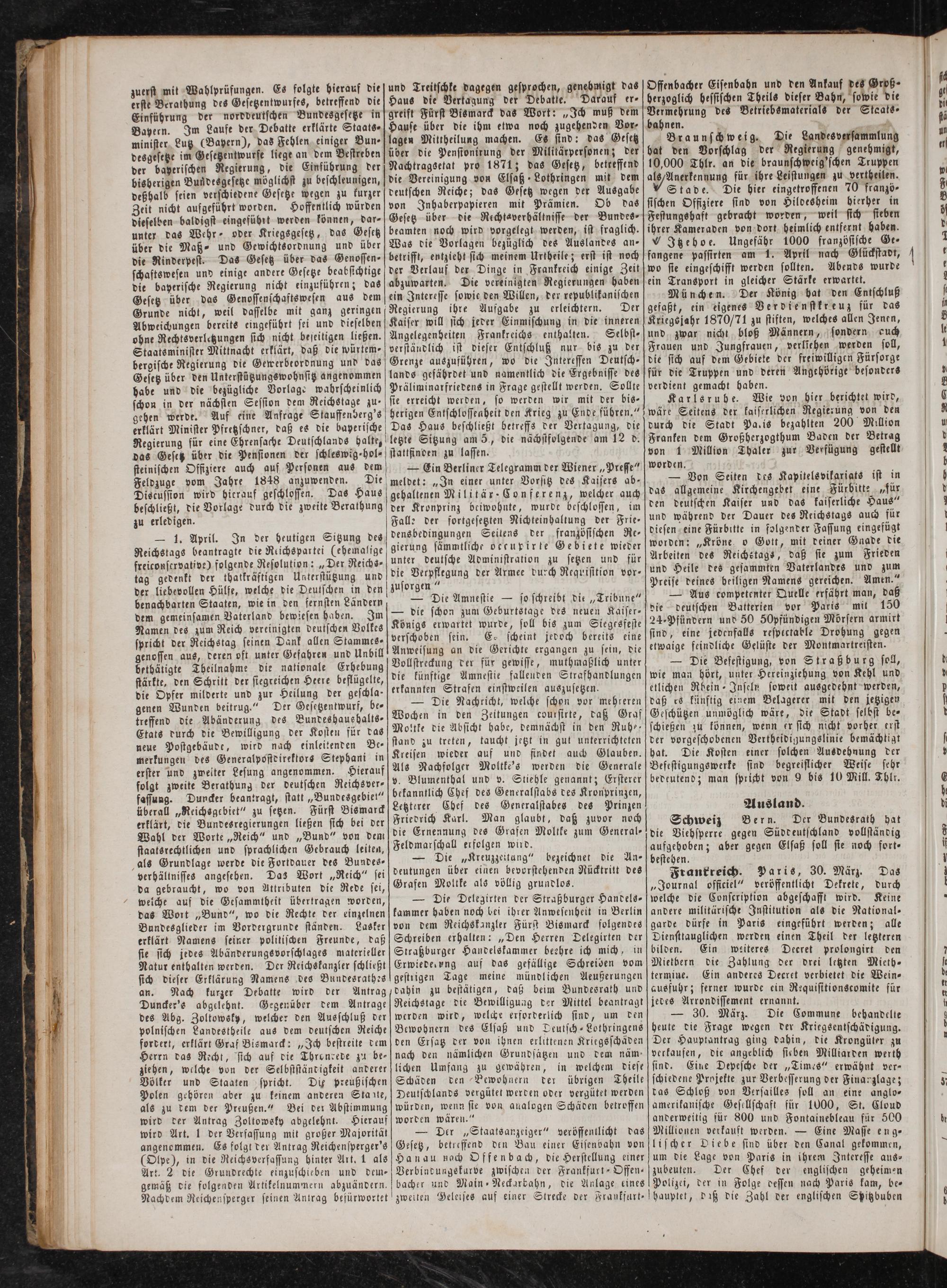 Frankreich. Paris, 30. März. Das „Journal officiel“ veröffentlicht Dekrete, durch welche die Conscription abgeschafft wird. Keine andere militärische Institution als die National- garde dürfe in Paris eingeführt werden; alle Diensttauglichen werden einen Theil der letzteren