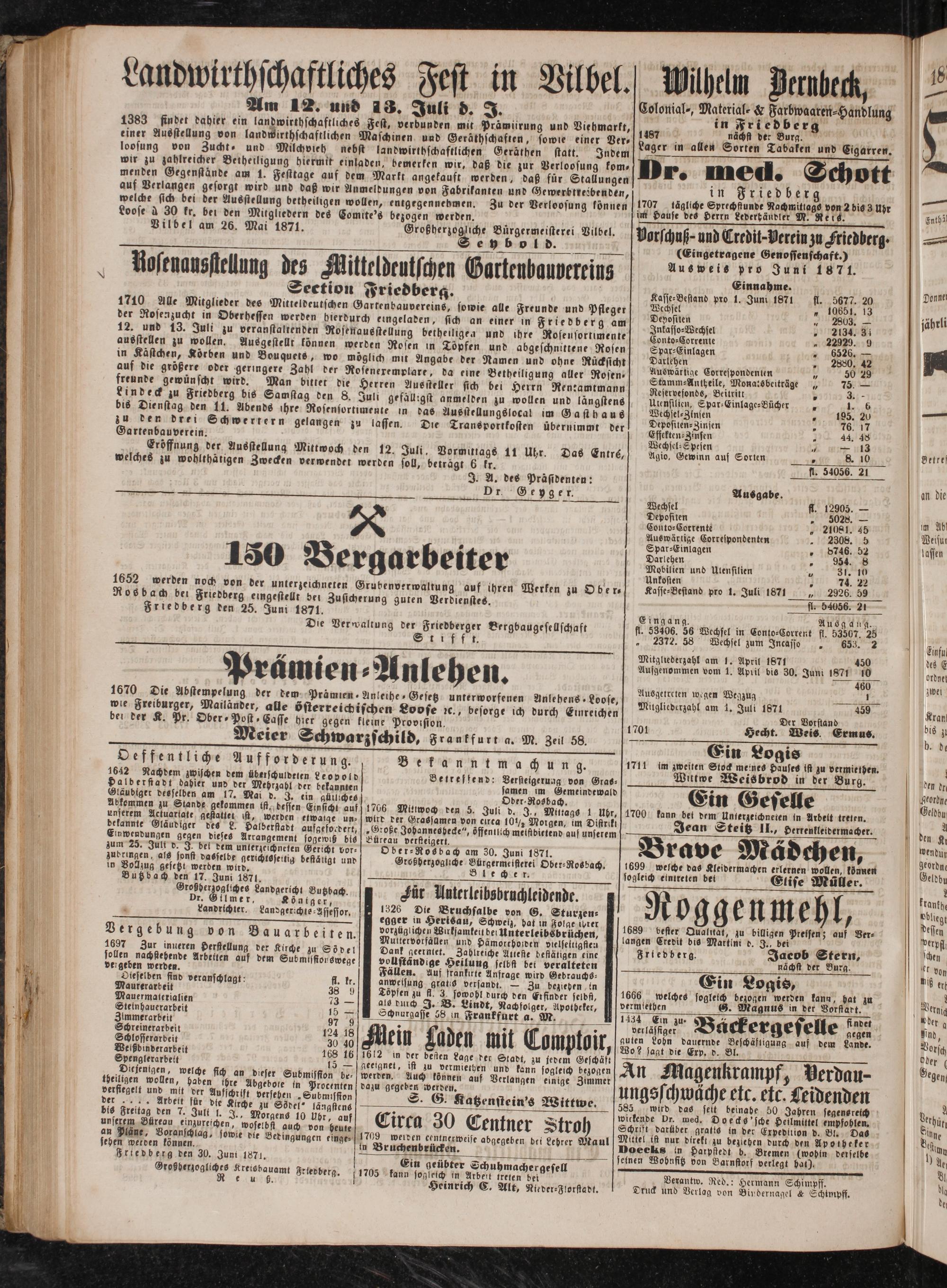1652 werden noch von der unterzeichneten Grubenverwaltung auf ihren Werken zu Ober⸗ Rosbach bei Friedberg eingestellt dei Zusicherung guten Verdienstes Friedberg den 25. Juni 1871.