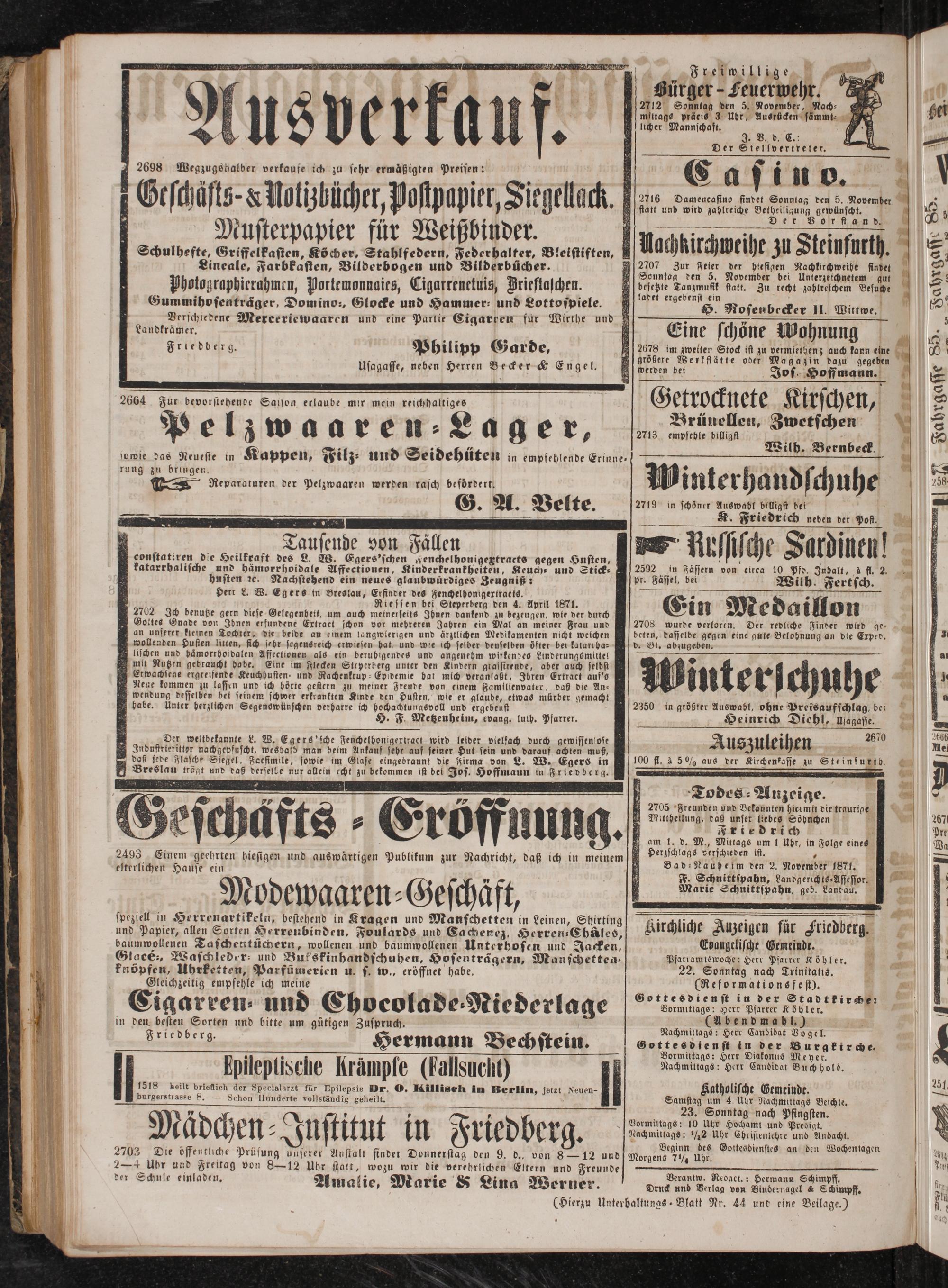 speziell in Herrenartikeln, bestehend in Kragen und Manschetten in Leinen, Shirting!, irc 9 5 5 5 und Papier, allen Sorten Herreubinden, Foulards und Cachenez. Herren-Chäles, Kirchliche Alzeigen für Iriedberg.
