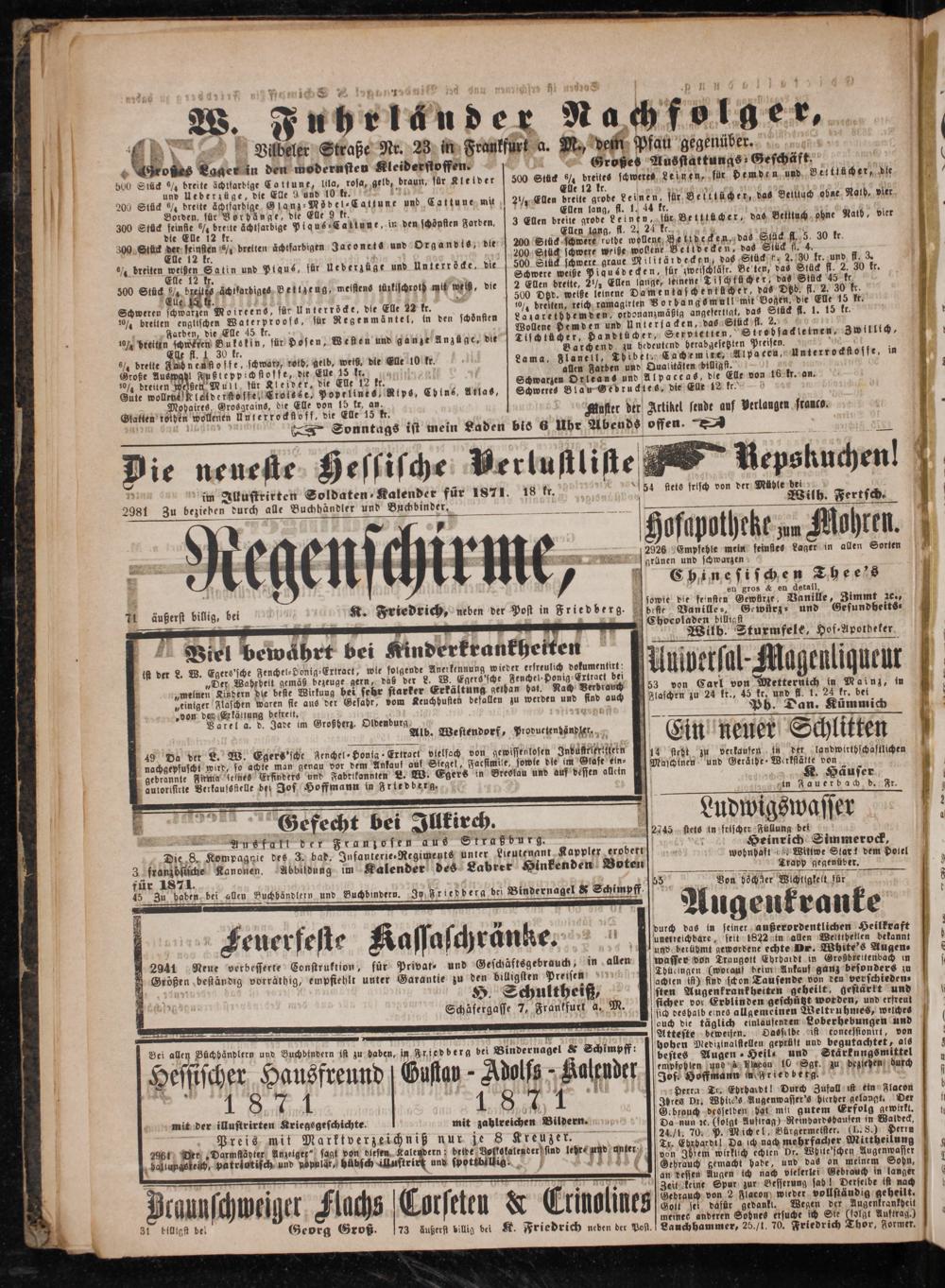 Atteste beweisen. Dasselbe ist concessionirt, von hohen Medizinalstellen geprüft und begutachtet, als bestes Augen Heils und Stärkungsmittel empfohlen und à Flacon 10 Sgr. zu beziehen durch Jos. Hoffmann in Friedberg..