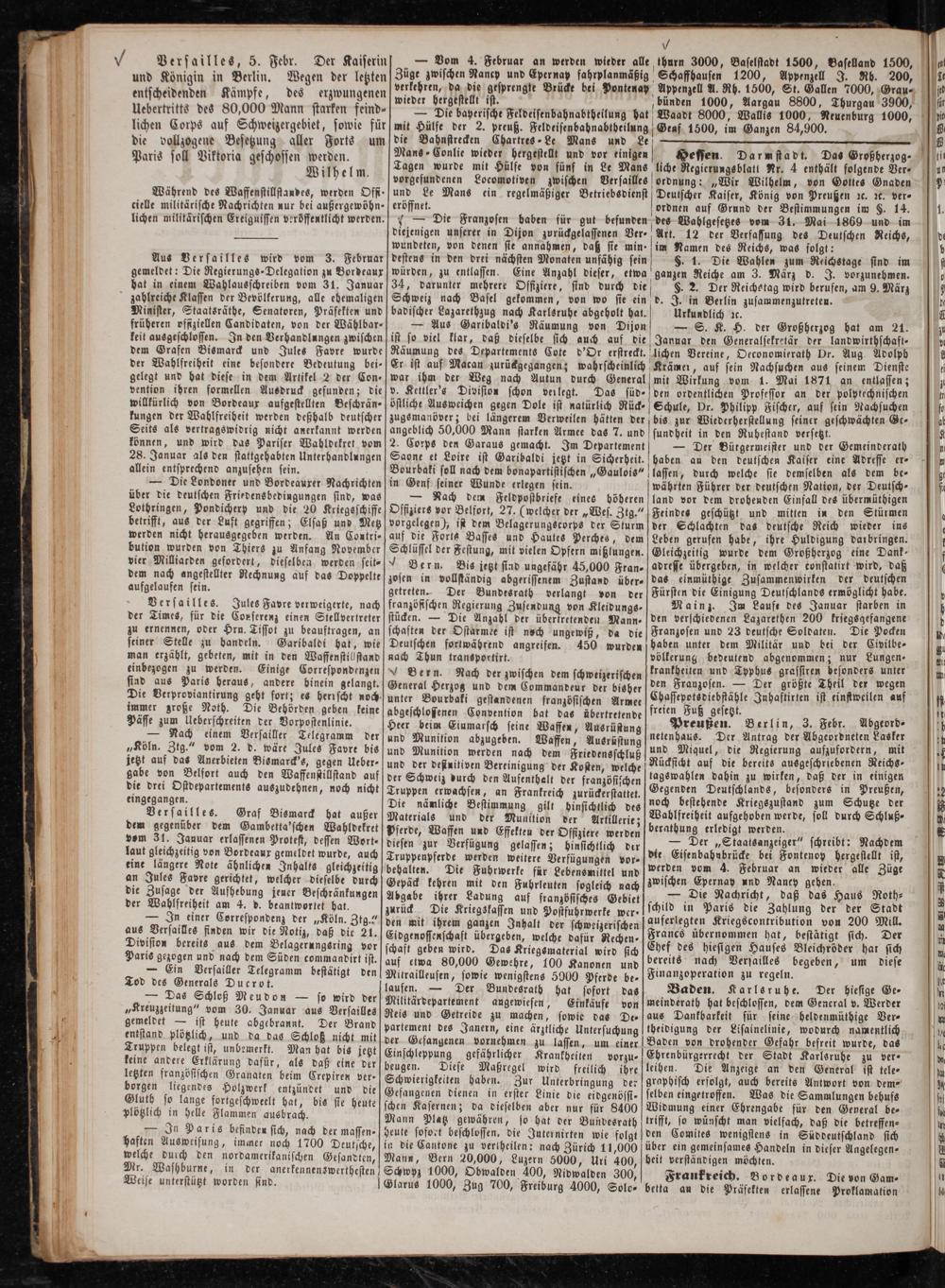 Versailles, 5. Febr. Der Kaiserin und Königin in Berlin. Wegen der letzten entscheidenden Kämpfe, des erzwungenen Uebertritts des 80,000 Mann starken feind⸗ lichen Corps auf Schweizergebiet, sowie für die vollzogene Besetzung aller Jorts um Paris soll Viktoria geschossen werden.