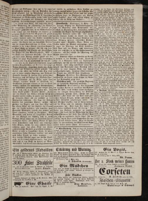 Montur- und Rüstkammer schon jetzt in die neuen Garnisonsorte verlegt. Die im Nordosten von Elsaß gelegenen und zu Garnssonen geeigneten Orte werden von Abtbeilangen des 2. baperischen Armeecorps als Reichstruppen besetzt; auch sollen in gleicher Eigenschaft der Besatzung von Metz bayerische Heeresabtheilungen zugetheilt werden. — Durch einen Brief, den nach einer Ver- sailler Mittheilung im„Staats anz.“ ein Soldat der französischen Ostarmee an das Journal„Le Frangais“ geschrieben hat, ist die Aufmerksamkeit noch einmal auf das Schicksal der verloren ge— gangenen Fahne des 61. Regiments gelenkt worden. Wir berichteten, daß diese Fahne nicht erobert, sondern unter den Leichen preußischer Soldaten und unter Schwerverwundeten gesunden wurde. Der Finder war ein französischer Soldat. Als der jüngere Garibaldi von der Sache erfuhr, wünschte er die leichten Spiels erworbene Trophäe in seinen Besitz zu bringen. Er bot dem frau zösischen Soldaten 200 Franken und eine Stellung sals Offizier bei den Montirungswesen, wenn er die Fahne den Italienern überlasse. Der Fran- zose wies diesen Antrag entrüstet zurück und be— stichtete die ganze Angelegenheit dem französischen Journal, von dem sie veröffentlicht worden ist — Die in den Friedenspräliminarien ausge- sprochene Verzichtleistung auf Belfort hat einiger] Maßen überrascht. Inzwischen wurde von Sach- kunvigen zur Erläuterung geltend gemacht, daß Belfort nicht allein, wie freilich auch Metz selbst, und in seiner nächsten Umgebung von National- Franzosen bewohnt ist, sondern seiner militärischen Bedeutung nach viel weniger ein„Aasfalls-Thor“ gegen Deutschland als ein Riegel gegen einen etwaigen deutschen Einfall in Fraukreich sei, Verschiedene Zeitungen erinnern an das betreffende Urtheil, welches der militärische Berichterstatter der Schlesischen Zeitung schon vor einiger Zeit, als sie noch nicht in unseren Händen war, über diesen Punkt gefällt. Derselde schricb:„Sollte auf den Erwerb von Belfort vielleicht schließlich verzichtet werden müssen, so würde uns das damit zu bringende Opfer als ein unschwer zu ver— schmerzendes erscheinen. Die Lage der Festung inmitten des natürlichen Thores, welches sich zzwischen den Vogesen und dem Jura öffnet und den oberen Elsaß mit den Thälern des Oignon mund des Doubs verbindet, gibt demselben zwar sstrategische Wichtigkeit, dennoch aber möchten wir davon abmabhnen, dieselbe zu überschätzen. Aller (Voraussicht nach werden die französischen Gebiete aan den Grönzen der Schweiz auch in einem künftigen Kriege immer nur ein secundäres Opera- itionsgebiet bilden. Die Festung Belfort ist schon ihren Dimensionen nach keiner von denjenigen festen Plätzen, welche bei einer Offensiv-Unter— nehmung gegen das obere Elsaß dem Feinde