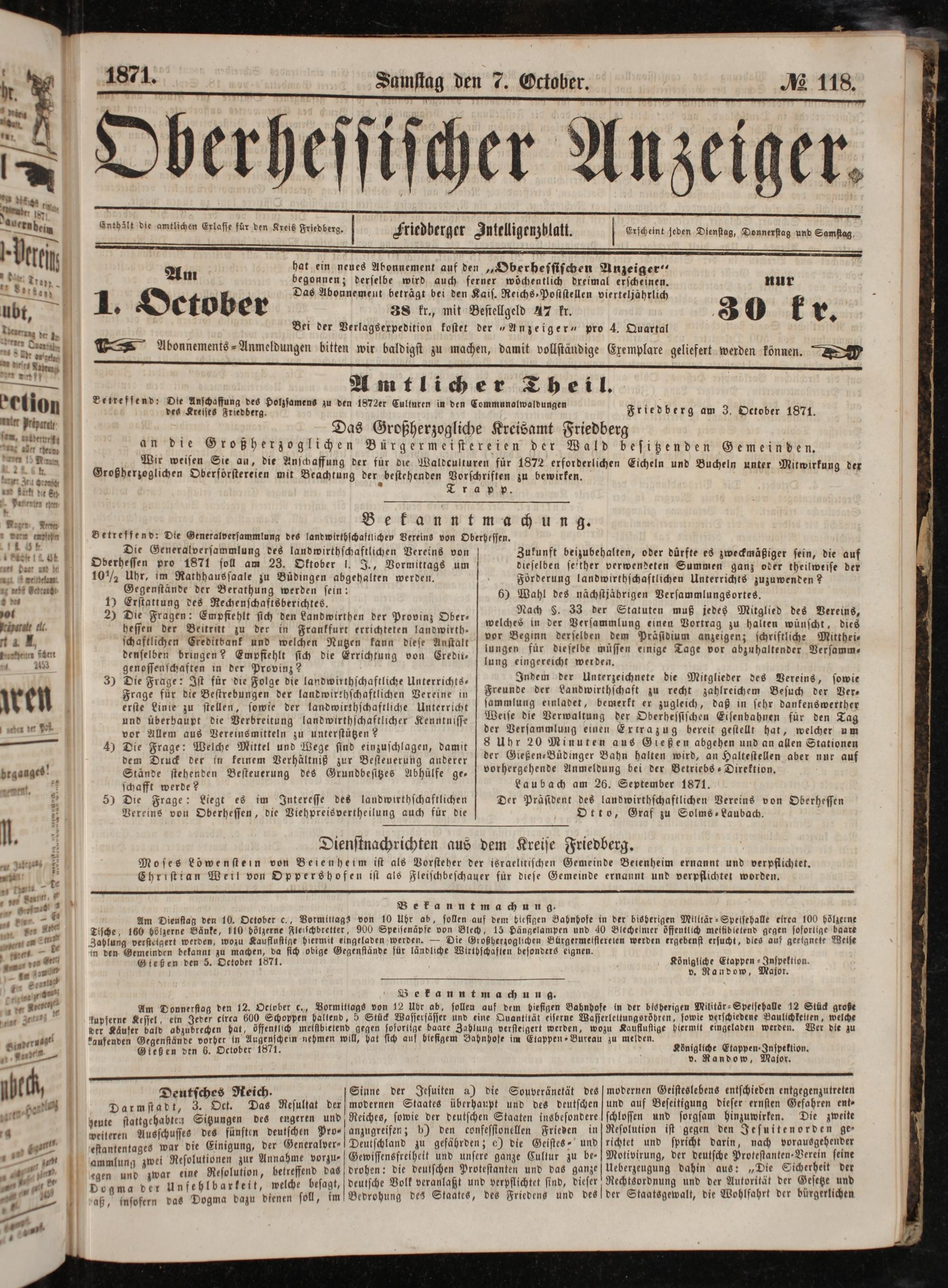 des Kreises Friedberg. Friedberg am 3. October 1871.