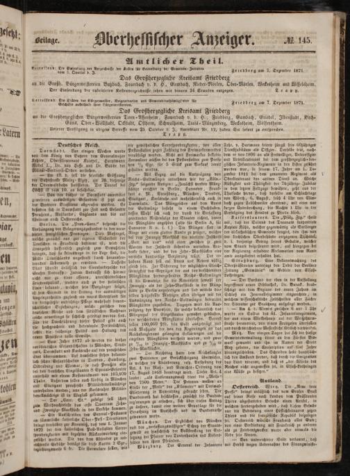 Deutsches Reich. Darmstadt. Vor einigen Wochen wurde von dem König von Bapern dem Generalmajor Kehrer, Oberstlieutenant Knispel, Hauptmann Riedel I., Dr. von Hesse und Dr. Budde der Militär-Verdienst-Orden verliehen.