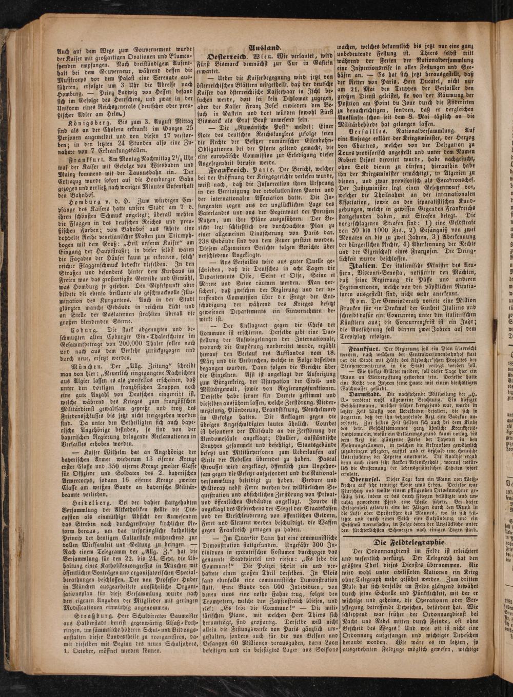 Frankreich. Paris. Der Bericht, welcher bei der Eröffnung der Kriegsgerichte verlesen wurde, weist nach, daß die Insurrettion ihren Ursprung in der Vereinigung der revolutionären Partti und der internationalen Assotialion hatte. Die In- surgenten zogen aus der unglücklichen Lage des Vaterlandes und aus der Gegenwart der Preußen Nutzen, um ihre Pläne auszuführen. Der Be⸗ richt legt schließlich den durchdachten Plan zu einer allgemeinen Einäscherung von Paris dar. 238 Gebände sind von dem Feuer zerstört worden. Diesem allgemeinen Berichte folgen Berichte über verschiedene Angeklagte.
