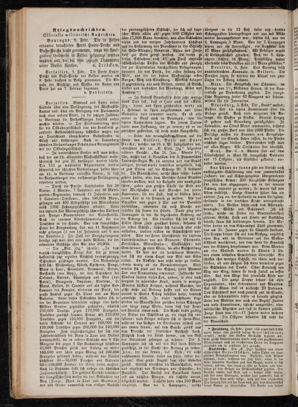 Versailles, 9. Febr. Die Forts Haute Perche und Basse⸗Perche vor Belfort wurden am 8. Febr. diesseits in Besitz genommen. Die Ab- gabe der Geschütze und Waffen der Armee von Paris hat am 7. Februar begonnen.