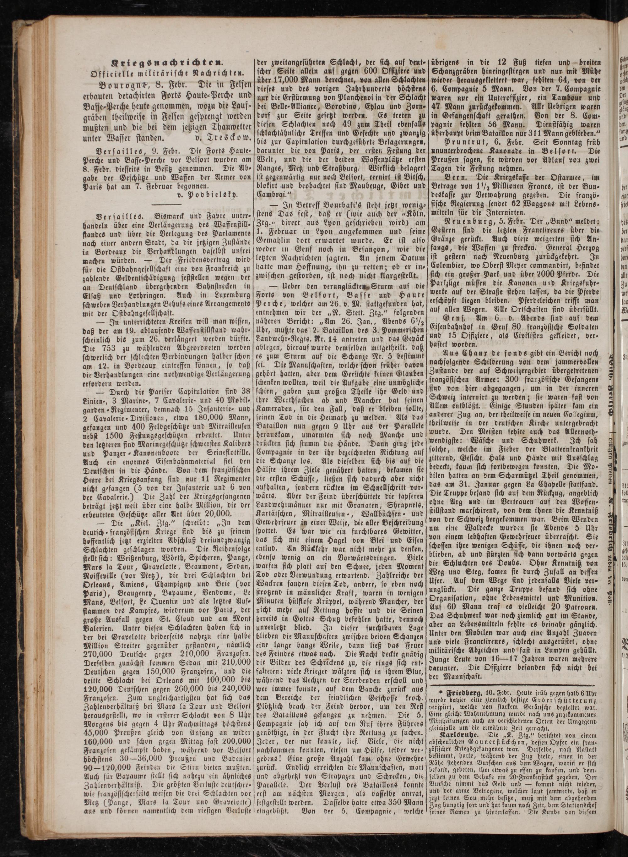 «Friedberg, 10. Febr. Heute früh gegen halb 6 Uhr wurde dahier eine ziemlich heftige Erderschütterung verspürt, welche von starkem Geräusche begleitet war. Eine gleiche Wahrnehmung wurde nach uns zugekommenen Miitheilungen auch an verschiedenen Orten der Umgegend gleichfalls um die erwähnte Zeit gemacht.