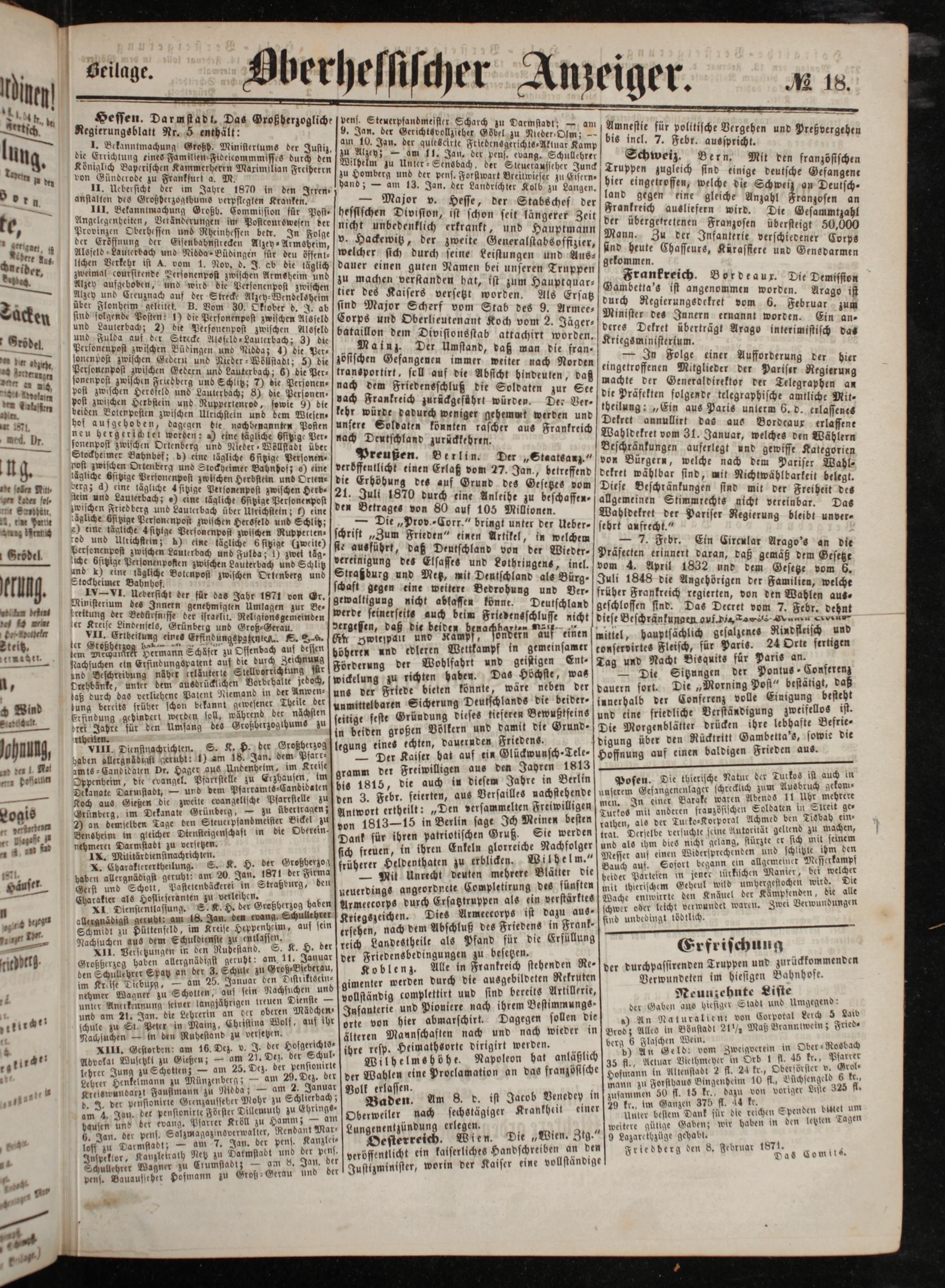 Asitzige Personenpost zwischen Rupperlen⸗ schrift„Zum Frieden“ einen Artikel, in welchem sie ausführt, daß Deutschland von der Wieder- ig vereinigung des Elsasses und Lothringens, incl. wischen Lauterbach und Schlitz l 4 und k) eine tägliche 8 und Straßburg und Metz, mit Deutschland als Bürg⸗ schaft gegen eine weitere Bedrohung und Ver⸗ gewaltigung nicht ablassen könne. werde seinerseits auch beim Friedensschlusse nicht Lindenfels, Grünberg und Groß⸗Gerau. dergessen, daß die beiden fran uf einen ines d S. G. tespalt 1 g auch Sanne il ng ef. 3 5 edleren Wettkampf in gemeinsamer