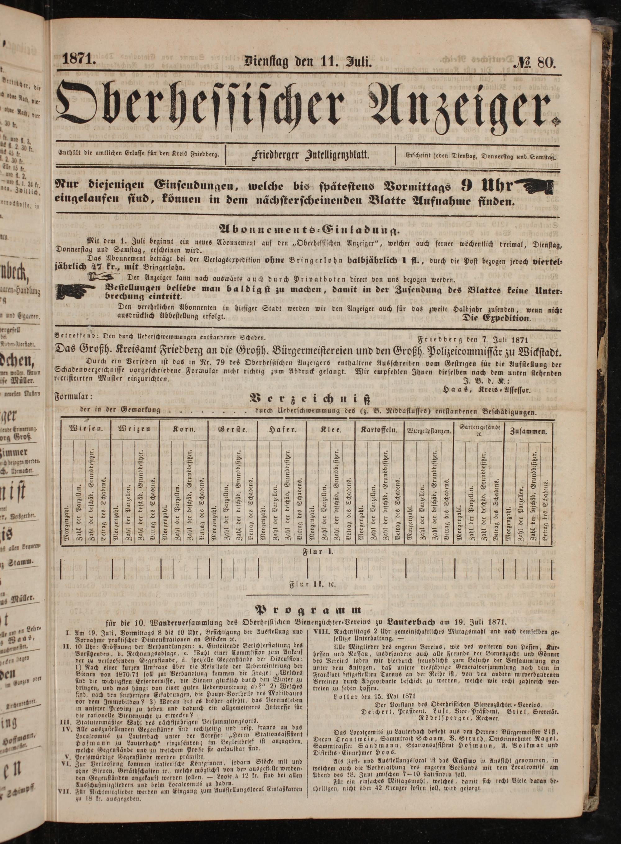 Betreffend: Den durch Ueberschwemmungen entflandenen Schaden. Friedberg den 7. Juli 1871