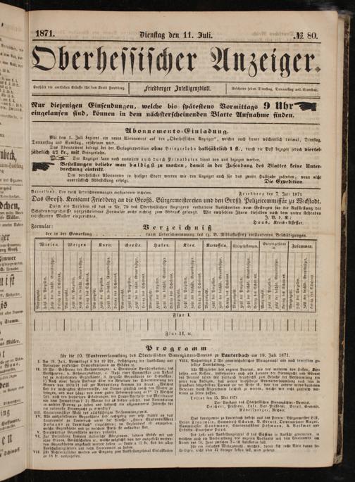 Mit dem 1. Juli beginnt ein neues Abonnement auf den„Oberhessischen Anzeiger“, welcher auch ferner wöchentlich drei i Donnerstag und Samstag, erscheinen wird. f e et ee e