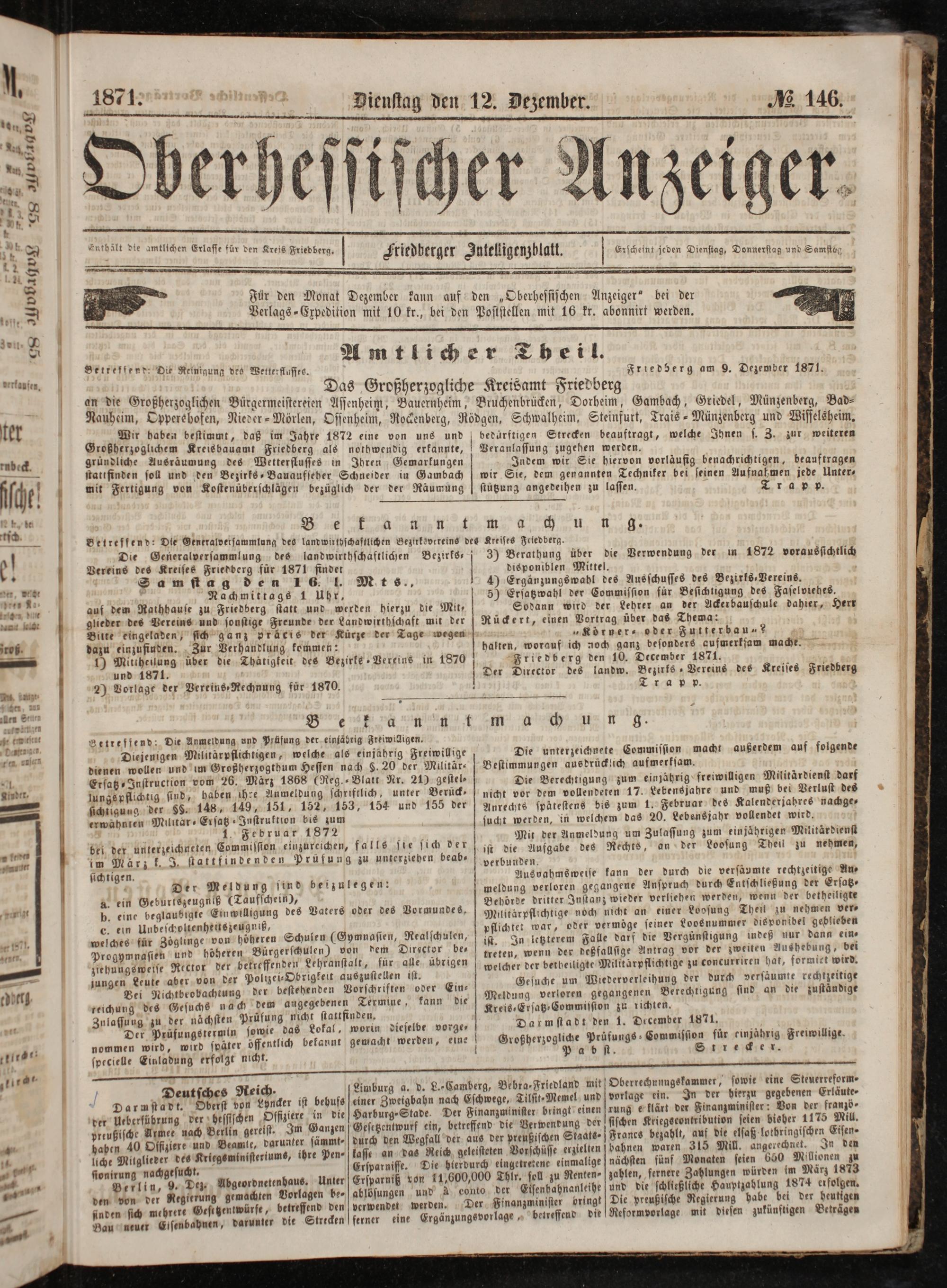 Die Generalversammlung des Vereins des Kreises Friedberg für 1871 findet Samstag den 16. l. Nachmittags 1 Uhr,