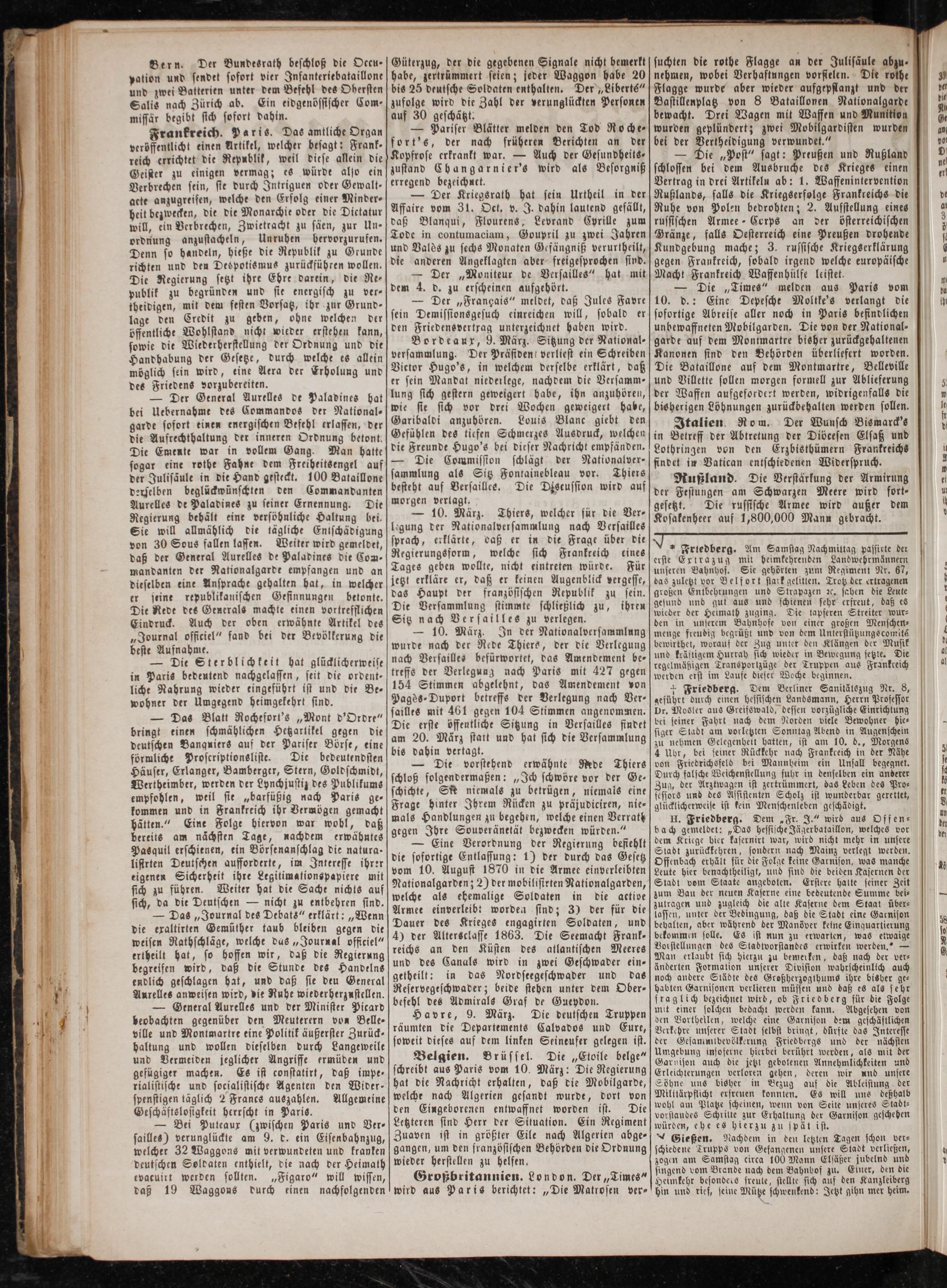 — 10. März. In der Nationalversammlung wurde nach der Rede Thiers, der die Verlegung nach Versailles befürwortet, das Amendement be— treffs der Verlegung nach Paris mit 427 gegen 154 Stimmen abgelehnt, das Amendement von Pagds-⸗Duport betreffs der Verlegung nach Ver— sailles mit 461 gegen 104 Stimmen angenommen. Die erste öffentliche Sitzung in Versailles findet am 20. März statt und hat sich die Versammlung bis dahin vertagt.