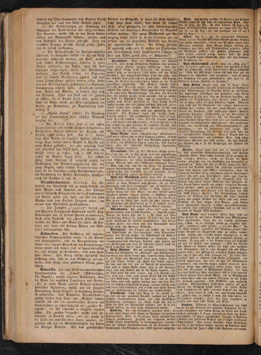 — Vor Parie haben noch in den letzten Tagen Attentate auf deutsche Truppen stattgefunden. Verschiedene Blätter meldeten vor Kurzem aus Chelles einen solchen Fall Am 5. d. wurde beim Fort Roeng ein deutscher Soldat erstochen; einige Tage vorher wurde Nachts in Neuilly auf einen Posten geschossen, der aber unverletzt blieb und seinerseits das Glück hatte, den Angreifer im Grsäße derart zu treffen, daß er 100 Schritte davon im Graben liegen blieb. Die nächste Folge dieser Attentate ist natürlich einmal die Verhängung des Belagerungszustandes über die ganze Gegend, sowie erhöhte Einquartierung und dann für die Deutschen erböhte Vorsichtsmaß regeln, als Verstärkung der Posten, Patrouillen, Consigni— rung der Truppen u. dgl. m.