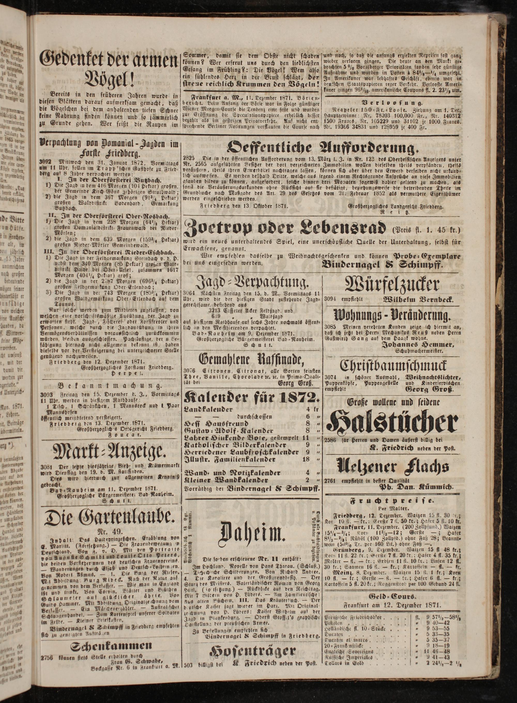 3081 Der letzte diesjährige Vieh, und Krämermarkt wird Dlenstag den 19. d. M. slattfinden. Diese wird hierdurch zur allgemeinen Kenntniß bracht. i 7— am 11. Dezember 1871. Großherzogliche Bürgermeiflere! Bad Nauheim. Schutt.