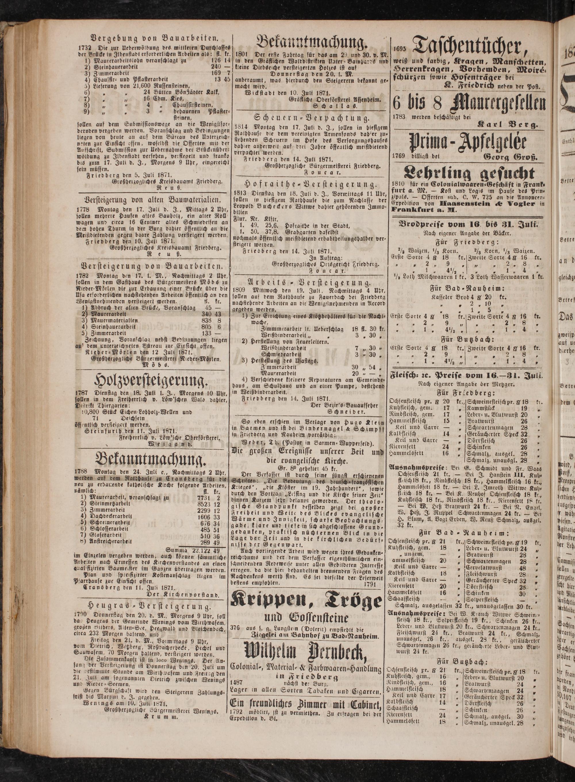 1778 Montag den 17. Juli d. J., Mittags 2 Uhr, sollen mehrere Haufen altes Bauholz, ein alter Roll wagen und circa 16 Centner altes Schmiedeisen an dem hoben Thurm in der Burg dahier öffentlich an die Meistbietenden gegen baare Zablung verfteigert werden. Friedberg den 10. Juli 1871. Großherzogliches Kreigbauamt Friedberg. Re u