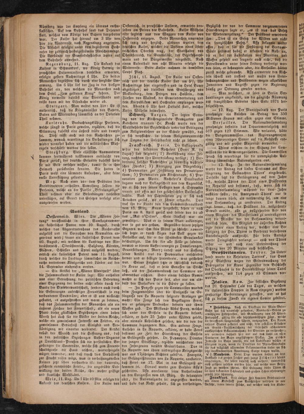 Regensburg, 11. Aug. Die Ankunft des Kaisers in Schwandorf, wo König Ludwig in preußischer Husarenuniform denselben erwartete, erfolgte gestern Nachmittags 4 Uhr. Die beiden Monarchen begrüßten sich durch eine herzliche Um⸗ armung. Um 6 Uhr lief der Zug in den hiesigen Bahnhof ein, von welchem die Monarchen nach dem Hotel„Zum goldenen Kreuz“ fuhren. Der König verweilte daselbst eine Viertelstunde und reiste dann mit der Eisenbahn wieder ab.