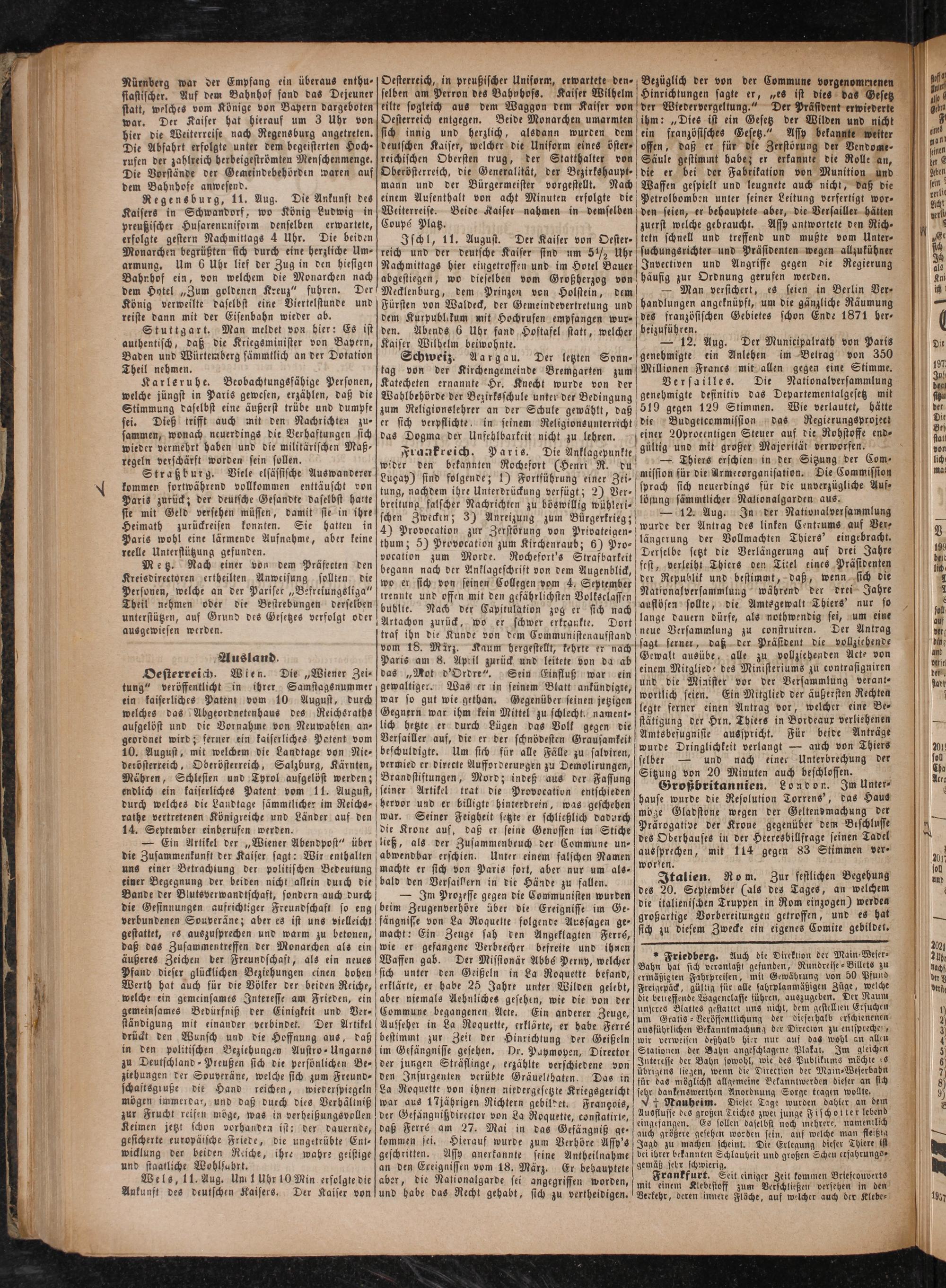 — Man versichert, es seien in Berlin Ver⸗ handlungen angeknüpft, um die gänzliche Räumung des französischen Gebietes schon Ende 1871 ber⸗ beizuführen.