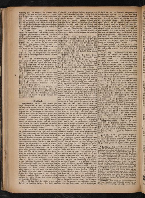 Oesterreich. Wien. Die„Wiener Zei⸗ tung“ veröffentlicht in ihrer Samstagsnummer ein kaiserliches Patent vom 10 August, durch welches das Abgeordnetenhaus des Reichsraths aufgelöst und die Vornahme von Neuwahlen an- geordnet wird; ferner ein kaiserliches Patent vom 10. August, mit welchem die Landtage von Nie— derösterreich, Oberösterreich, Salzburg, Kärnten, Mähren, Schlesien und Tyrol aufgelöst werden; endlich ein kaiserliches Patent vom 11. August, durch welches die Landtage sämmilicher im Reichs- rathe vertretenen Königreiche und Länder auf den 14. September einberufen werden.