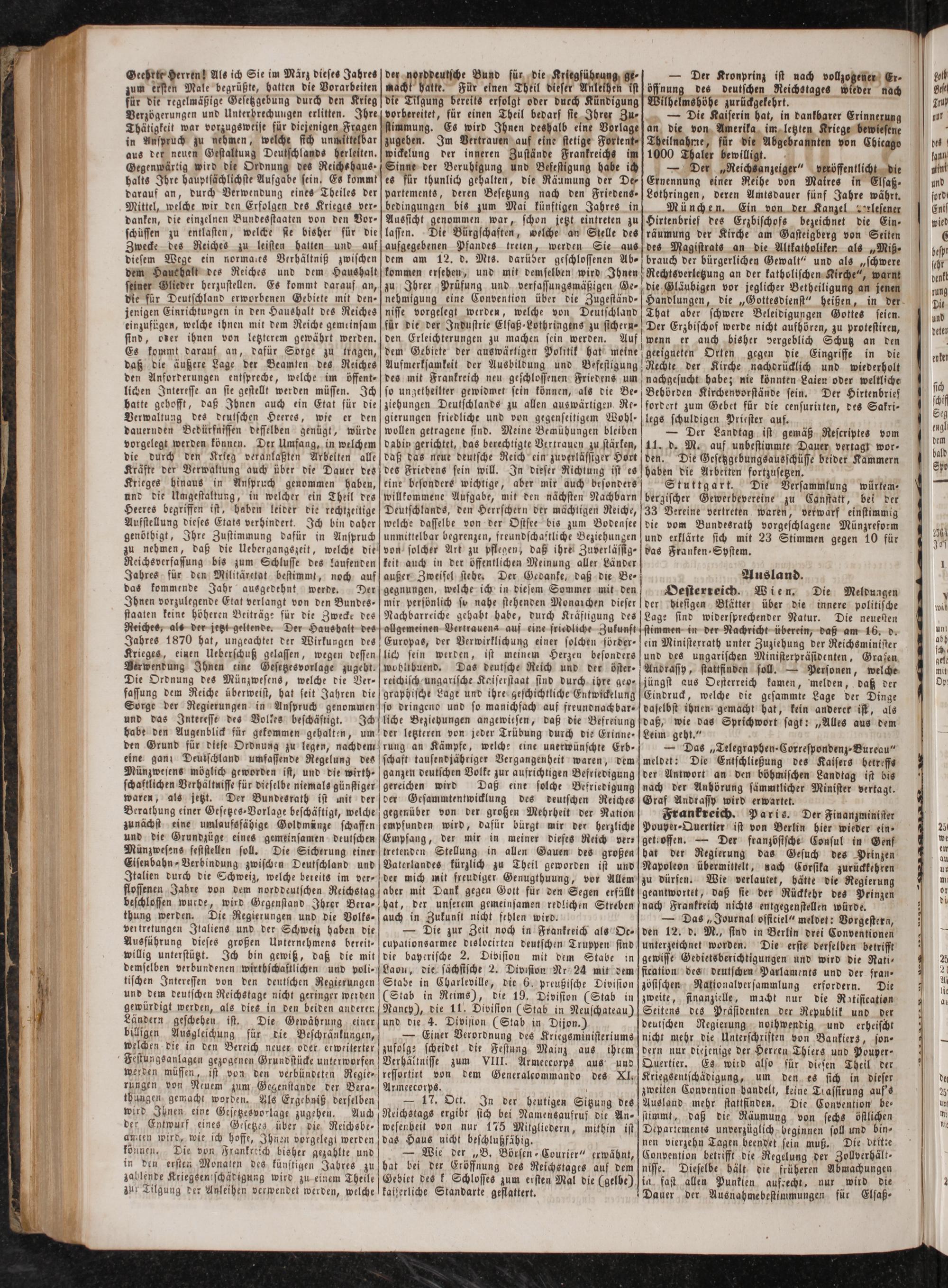 der norddeutsche Bund für die Kriegführung ge⸗ macht hatte. Für einen Theil dieser Anleihen ist die Tilgung bereits ersolgt oder durch Kündigung vorbereitet, für einen Theil bedarf sie Ihrer Zu⸗ stimmung. Es wird Ihnen deshalb eine Vorlage zugeben. Im Vertrauen auf eine stetige Fortent⸗ wickelung der inneren Zustände Frankreichs im Sinne der Beruhigung und Befestigung habe ich es für thunlich gehalten, die Räumung der De⸗ partements, deren Besetzung nach den Friedens- bedingungen bis zum Mai künftigen Jahres in Aussicht genommen war, schon jetzt eintreten zu lassen. Die Bürgschaften, welche an Stelle des aufgegebenen Pfandes treten, werden Sie aus dem am 12. d. Mts. darüber geschlossenen Ab⸗ kommen ersehen, und mit demselben wird Ihnen zu Ihrer Prüfung und verfassungsmäßigen Ge⸗ nehmigung eine Convention über die Zugeständ— nisse vorgelegt werden, welche von Deutschland für die der Industrie Elsaß⸗Lothringens zu sichern⸗ den Erleichterungen zu machen sein werden. Auf dem Gebiete der auswärtigen Politik hat meine Aufmerksamkeit der Ausbildung und Befestigung des mit Frankreich neu geschlossenen Friedens um so ungetheilter gewidmet sein können, als die Be— ziehungen Deutschlands zu allen auswärtigen Re— gierungen friedliche und von gegenseitigem Wohl— wollen getragene sind. Meine Bemühungen bleiben dabin gerichtet, das berechtigte Vertrauen zu stärken, daß das neue deutsche Reich ein zuverlässiger Hort des Friedens sein will. In dieser Richtung ist es eine besonders wichtige, aber mir auch besonders willkommene Aufgabe, mit den nächsten Nachbarn Deutschlands, den Herrschern der mächtigen Reiche, welche dasselbe von der Ostsee bis zum Bodensee unmittelbar begrenzen, freundschaftliche Beziehungen von solcher Art zu pflegen, daß ihre Zuverlässig— keit auch in der öffentlichen Meinung aller Länder außer Zweifel stehe. Der Gedanke, daß die Be— gegnungen, welche ich in diesem Sommer mit den mir persönlich so nahe stehenden Monarchen dieser Nachbarreiche gehabt habe, durch Kräftigung des allgemeinen Vertrauens auf eine friedliche Zukunft Europas, der Verwirklichung einer solchen förder— lich sein werden, ist meinem Herzen besonders wohltbuend. Das deutsche Reich und der öster⸗ reichisch⸗ungarische Kaiserstaat sind durch ihre geo— graphische Lage und ihre geschichtliche Entwickelung so dringeno und so manichfach auf freundnachbar— liche Beziehungen angewiesen, daß die Befreiung der letzteren von jeder Trübung durch die Erinne- rung an Kämpfe, welche eine unerwünschte Erb— schaft tausendjähriger Vergangenheit waren, dem ganzen deutschen Volke zur aufrichtigen Befriedigung gereichen wird Daß eine solche Befriedigung der Gesammtentwicklung des deutschen Reiches gegenüber von der großen Mehrheit der Nation empfunden wird, dafür bürgt mir der herzliche Empfang, der mir in meiner dieses Reich ver— tretenden Stellung in allen Gauen des großen Vaterlandes kürzlich zu Theil geworden ist und der mich mit freudiger Genugthuung, vor Allem aber mit Dank gegen Gott für den Segen erfüllt hat, der unserem gemeinsamen redlichen Streben auch in Zukunft nicht fehlen wird.