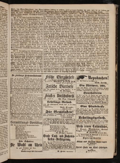 Art. 7. Die Zahlung von 500,000,000 Fres. wird innerhelb der dreißig Tage stattfinden, welche der Wiederherstellung der Autorität der franzö⸗ sischen Regierung in der Stadt Paris folgen werden. Eine Milliarde wird im Laufe des Jahres be⸗ zahlt und eine halbe Milliarde am 1. Mai 1872. Die drei letzten Milliarden werden am 2. Mai zahlbar sein, wie es in dem Präliminarfriedens- vertrage festgesetzt worden war. Vom 2. März des laufenden Jahres an werden am 3. März jeden Jabres 5 pCt. Zinsen für diese drei Mil— liarden bezahlt. Jede im Voraus auf diese drei Milliarden geleistete Summe wird vom Tage der
