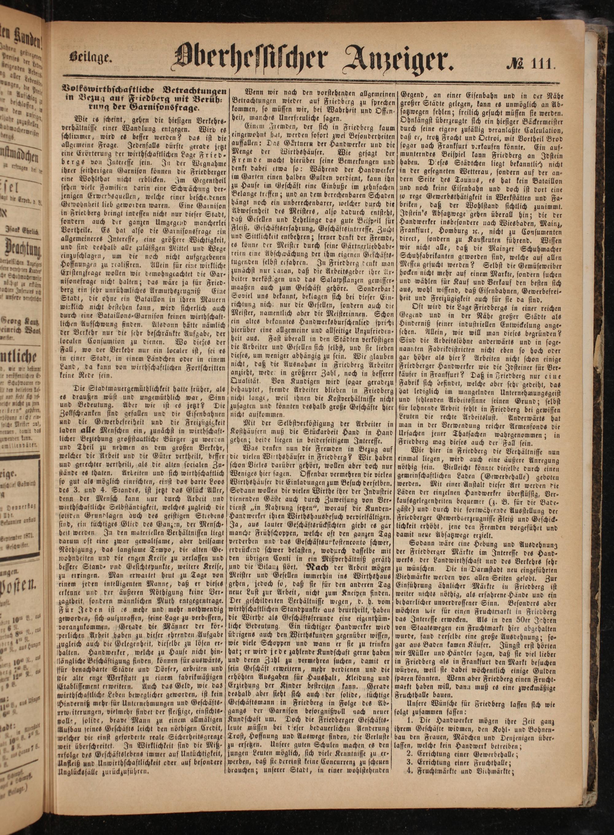 Wie es scheint, gehen die hiesigen Verkehrs⸗ verhältnisse einer Wandlung entgegen. Wird es schlimmer, wird es besser werden? das ist die allgemeine Frage. Jedenfalls dürfte gerade jetzt eine Erörterung der wirthschaftlichen Lage Fried- bergs von Interesse sein. In der Wegnahme ihrer seitherigen Garnison können die Friedberger eine Wohlthat nicht erblicken. Im Gegentheil sehen viele Familien darin eine Schwächung der⸗ jenigen Erwerbsquellen, welche einer bescherdenen Gewohnheit lieb geworden waren. Eine Garnison in Fried berg bringt indessen nicht nur dieser Stadt, sondern auch der ganzen Umgegend mancherlei Vortheile. Es hat also die Garnisonsfrage ein allgemeineres Interesse, eine größere Wichtigkeit, und sind deshalb alle zulässigen Mittel und Wege einzuschlagen, um die noch nicht aufgegebenen Hoffnungen zu realistren. Allein für eine wirkliche Existenzfrage wollen wir demohngtachtet die Gar— nisonefrage nicht halten; das waͤre ja für Fried- berg ein sehr unrühmliches Armuthszrugniß Eine Stadt, die ohne ein Bataillon in ihren Mauern wirklich nicht bestehen kann, wird sicherlich auch durch eine Bataillons-Garnison keinen wirthschaft— lichen Ausschwung finden. Alsdann hätte nämlich der Verkehr nur die sehr beschränkte Aufgabe, der localen Consumtion zu dienen. Wo diesßes der Fall, wo der Verkebr nur ein localer ist, sei es in einer Stadt, in einem Ländchen oder in einem Land, da kann von wirthschaftlichen Fortschritten keine Rede sein.