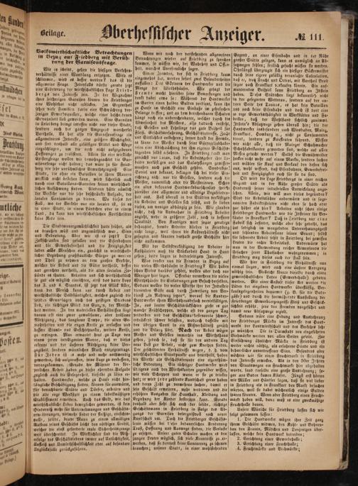 Sodann wäre eine Hebung und Ausdehnung der Friedberger Märkte im Interesse des Hand- werks der Landwirthschaft und des Verkehrs sehr zu wünschen. Die in Darmstadt neu eingeführten Viehmärkte werden vor allen Seiten gelobt. Zur Einführung ähnlicher Märkte in Friedberg ist weiter nichts nöthig, als erfahrene Hände und ein beharrlicher unverdrossener Sinn. Besonders aber möchten wir für einen Fruchtmarkt in Friedberg das Interesse erwecken. Als in den 50er Jahren von Staatswegen ein Fruchtmarkt hier abgehalten wurde, fand derselbe eine große Ausdehnung; so⸗ gar aus Baden kamen Käufer. Jüngst erst hörten wir Müller und Händler sagen, daß sie viel lieber in Friedberg als in Frankfurt den Markt besuchen würden, weil sie dabei wöchentlich einige Gulden sparen könnten. Wenn aber Friedberg einen Frucht- markt haben will, dann muß es eine zweckmäßige Fruchthalle bauen.