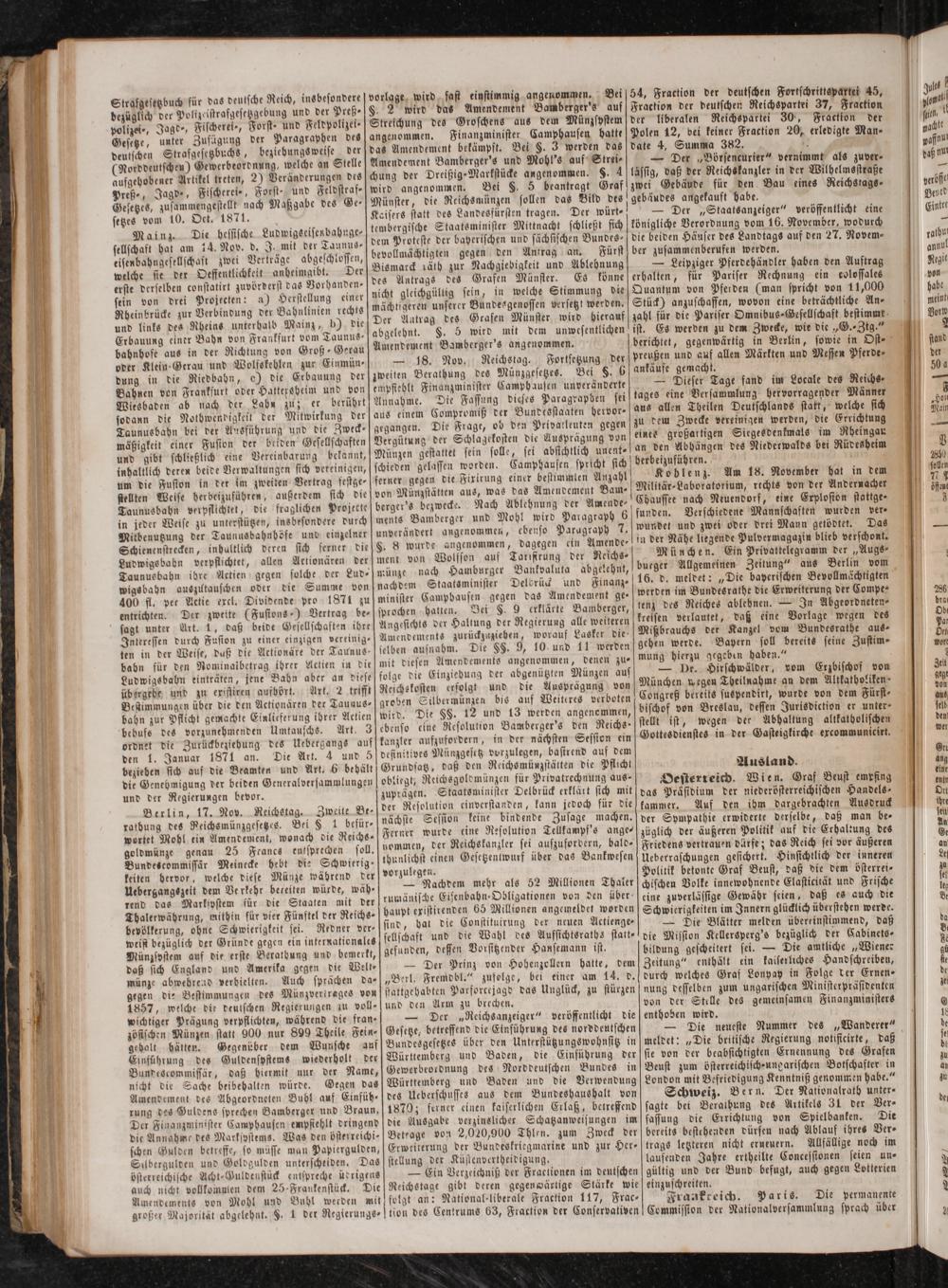 Berlin, 17. Nov. Reichstag. Zweite Be⸗ ratbung des Reichsmünzgesetzes. Bei§ 1 befür⸗ wortet Mohl ein Amendement, wonach die Reichs- goldmünze genau 25 Francs entsprechen soll. Bundescommissär Meinecke hebt die Schwierig: keiten hervor, welche diese Münze während der Uebergangszeit dem Verkehr beteiten würde, wäh'⸗ rend das Markspstem für die Staaten mit der Thalerwährung, mithin für vier Fünftel der Reichs- bevölkerung, ohne Schwierigkeit sei. Redner ver— weist bezüglich der Gründe gegen ein internationalts Münzsostem auf die erste Beratbung und bemerkt, daß sich England und Amerika gegen die Welt münze abwehrend verhielten. Auch sprächen da— gegen die Bestimmungen des Münzvertreges von 1857, welche die deutschen Regierungen zu voll- wichtiger Prägung verpflichten, während die fran zösischen Münzen statt 900 nur 899 Theile Fein- gehalt hätten. Gegenüber dem Wunsche auf Einführung des Guldensystems wiederholt der Bundescommissär, daß hiermit nur der Name, nicht die Sache beibehalten würde. Gegen das Amendement des Abgeordneten Buhl auf Einfüh- rung des Guldens sprechen Bamberger und Braun, Der Finanzminister Camphausen empfiehlt dringend die Annahme des Marksostems. Was den österreichi— schen Gulden betreffe, so müsse man Papiergulden, Silbergulden und Goldgulden unterscheiden. Das österreichische Acht-Guldenstück entspreche übrigens auch nicht vollkommen dem 25 Fraukenstück. Die Amendements von Mohl und Buhl werden mit großer Majorität abgelehnt.§. 1 der Regierungs-