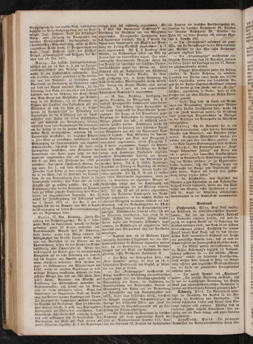 Oester teich. Wien. Graf Beust empfing das Präsidium der niederösterreichischen Handels- kammer. Auf den ihm dargebrachten Ausdruck der Sympathie erwiderte derselbe, daß man be⸗ züglich der äußeren Politik auf die Erhaltung des Friedens vertrauen därfe; das Reich sei vor äußeren Ueberraschungen gesichert. Hinsichtlich der inneren Politik betonte Graf Beust, daß die dem österrei⸗ chischen Volke innewohnende Elasticität und Frische eine zuverlässige Gewähr seien, daß es auch die Schwierigkeiten im Innern glücklich überstehen werde.
