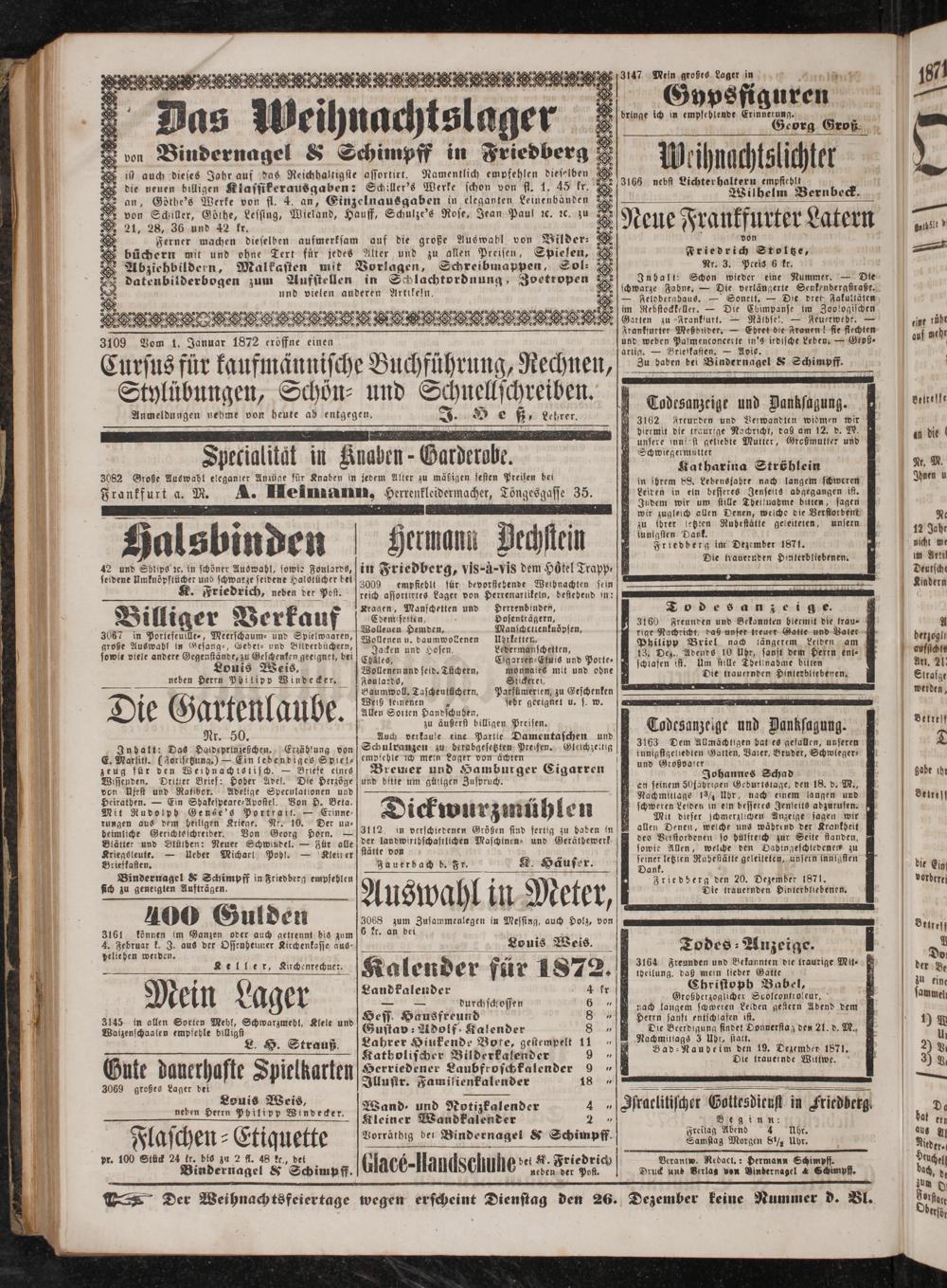 in ihrem 88. Lebensjahre nach langem schweren Leiden in ein besseres Jenseits abgegangen ist. Judem wir um stille Theilnabme bitten, sagen bwir zugleich allen Denen, welche die Verstorbent zu übrer letzten Ruhestätte geleiteten, unsern iunigsten Dank. Friedberg im Dezember 1871.