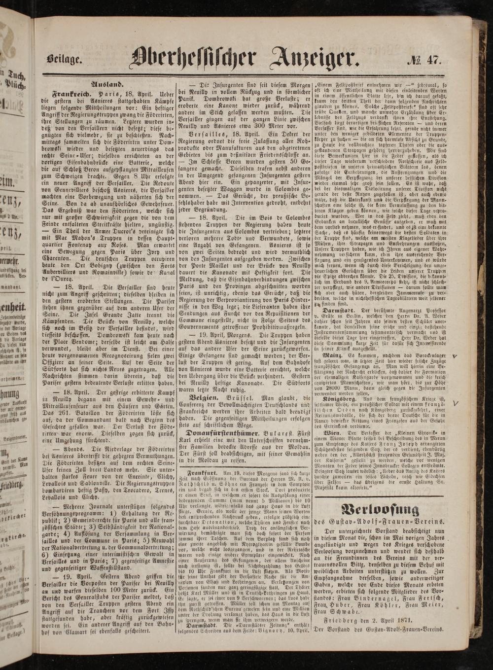 — Die Insurgenten sind seit diesem Morgen bei Neuilly in vollem Rückzug und in förmlicher Panik. Dombrowski hat große Verluste; er eroberte eine Kanone wieder zurück, während andere im Stich gelassen werden mußten. Die Versailler gingen auf der ganzen Linie zwischen Neuilly und Asnieres etwa 300 Meter vor.