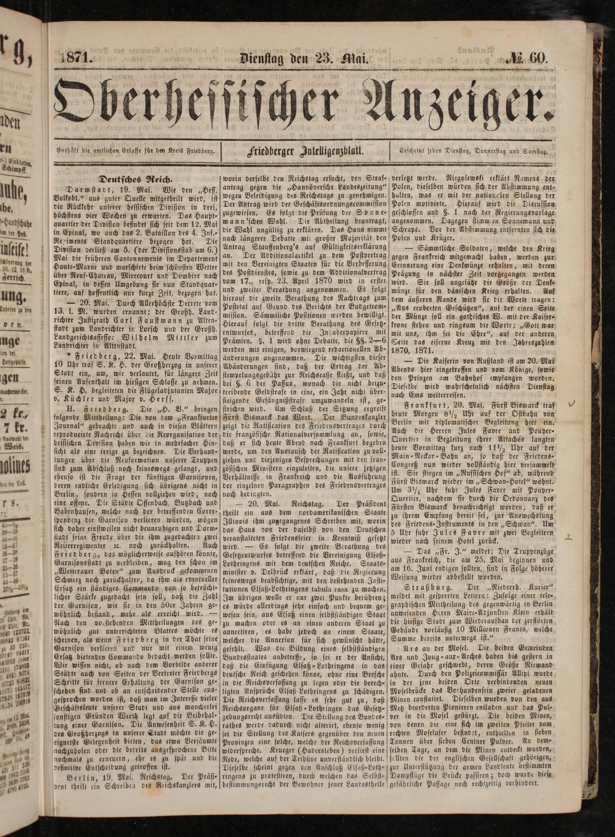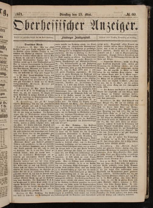 Darmstadt, 19. Mai. Wie den„Hess. Volksbl.“ aus guter Quelle mitgetheilt wird, ist die Rückkehr unserer hessischen Division in drei, höchstens vier Wochen zu erwarten. Das Haupt- quartier der Division befindet sich seit dem 12. Mai in Epinal, wo auch das 2. Bataillon des 4. Inf. Rebiments Standquartiere bezogen hat. Die Division verließ am 5.(der Divisionsstab am 6.) Mai die früheren Cantonnements im Departement Haute-⸗Marne und marschirte beim schönsten Wetter über Neuf- Chateau, Mirecourt und Dombire nach Epinal, in dessen Umgebung sie nun Standquar⸗ tiere, auf hoffentlich nur kurze Zeit, bezogen hat.