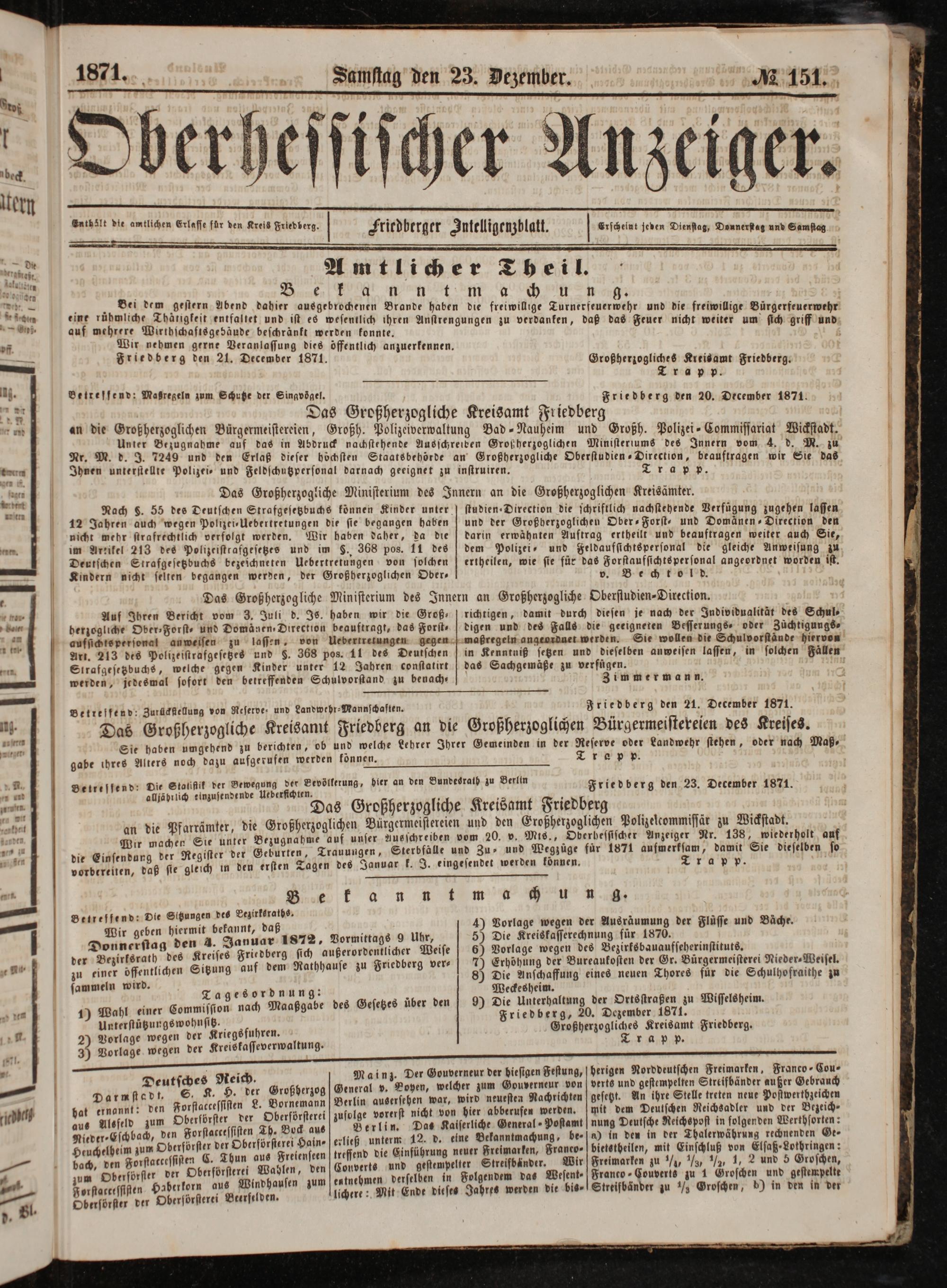 auf mehrere Wirthschaftsgebäude beschränkt werden konnte. Wir nehmen gerne Veranlassung dies öffentlich anzuerkennen. Friedberg den 21. December 1871.