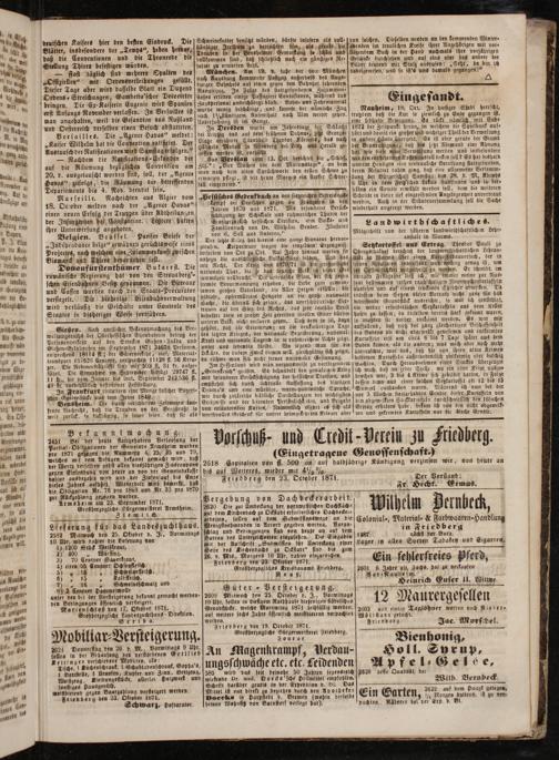 N Ala N Nic. deutschen Kaisers hier den best fil, en Eindruck. 1 8 e beer beten, öder dee b. ee ve 1 deil daß die Conventione 0 ervor, Trauben Jer zu beirachten sei ern als voll⸗] von solchen. Di uu di Stell N n und die Thronrede di Trauben in der 8 sein, als gerabe die] en. Dieselben werden an den komm a d Wr ung Thiers befestigen würden. NI Peukempren find, ee e se schön 11 Ade e Kreise ihrer ae ade digt. täglich sind mehrere Spalten des wee N sieht. eßlich noch ein günstiges Re⸗ Geschicr 5—ç ihre vorsahrigen Nei Di en“ mit Ordensverleihungen z nchen. Am 19. d. suh f Bilder deutend mi uf eins oder das andere d ; efüllt. nach Augsburg k fuhr der von München] dabei mit Stolz ausrusen:„S e der ** ieser Tage aber wird dasselbe Bl n gesuut.], goburg kommende Posizug außerhalb abeigewesen, und so ist' sen:„Seht, da bin ich „ e Ordens Strei e Blatt ein Dutzend daga Bahnhofs auf einen gegen d aid die, Auge ift uns bamals gegangen!“ 1 did bri reichungen, Gambetta'scher Decori Rangirzug. In Folge d dan den Auen een 1 ringen. Die E K 1 4 1 5 orirter stoßes 3 221487 9 es statlgefundenen. iu. l x. Kaiserin Eugenie wird n erlitten einige Passagiere C Zusammen⸗ 8 erst Anfangs November verlassen. In n ee e unbeschädig! bb. Wan ua 3 Ei II a0 man ungehalten, weil die Gesandten von— ist 11 e und konnte der 1 ingesandt. 18 und Oesterreich derselben einen N and Untersuchun igem Aufenthalt nach Ulm weiter ge 22 Nauheim, 18. Oct. In hi 2 ö N in N. Versai. Besuch abstatteten. g ist im Gange. gehen. trotzdem daß die Kur 2 hiesiger Slabt herrscht * 05 5 g ailles. Die„Agence Havas“ meldet: dei In Dresden wurde am Jahresta 8 eine lebhafte Bewe r so ziemlich zu Ende gegangen il. bee e e e f ub ausch der Ratificationen wir 1 Ga ete Standbild Theodor Kö gs, hört und damit ein„in welchem die Spielbank auf⸗ deten 3 f b Samslag erfolgen.“ Pͤͤcnels Modell in Ni 1 eners, das nach in andere Hä i großer und wichtiger Theil der Verwalt unt Nachdem die Rauffcallons⸗ gen.“ sossen worden it, enberg bei Lenz und Herold ge. anbere Gönde übregert. Gs i ober gerad. 3 ,. e Ceed eee fn. Chee. 5 V e Nee e a 1 e 05 etauscht worden si g.“:„Vier Wochen vor d J ie„Schles.] wer den 5 ung werden und insbes 5 Nedenb een n sind, soll, der„Agence man n r dem Martinstage“, an d enistehenden Kostenausfall deck esondere g 1 8555 zufolge, die Räumu ee ach dem alten Sprüchworte den ge“, an dem unterm Heutigen ei all decken soll? Es hat deshalb 05 uf n ere bis 4. Nov. e e f ehe ist seit heute Morgen 3 1 t 30 1b be a ö dordhugt I arseille. Nachrichten a 700. act Bürgerschaft Samstag den 28 eine Versamm⸗ 1 us 6 Uhr 5 g den 28. d. M. Ab. . 12 r nach der e e 2 77 1 an den siegreichen Befreiung dae 22 S e t. 1 1 der Hkatholiler euen Erfolg der Truppen üb ö 0 er Deutschen gegen die F a„Schritte in dieser tief eingrei ell, dem die weiteren 1 der Insur ppen über Abtheilungen Jabren 1870 und 1871. Mi Franzosen in den] werden. Auch i eingreifenden Angelegenpeit an f durg kintz. rgenten bei Constanti 5 ichti 1871. Mit besonderer Berück⸗ wi 1. Auch in der Ständ wertraut She. ihre Unterwerfung 1 e ne eber esche 81 4 485 de e 8 ee p. J. Bler Belgien. Brüssel. Paris Bri Familienbuch von b. Wülbeln Benbe Volks- und. 9 n dit Res„Indépendance belge“ exwä iser Briefe der von C. Sell und Anderen.“„ e e Landwirthschaftli 5 10* Projectes, nach. ähnen gerüchlsweise eines Der letzte Krieg hat bereits 0 Mitgetheilt von der hö. iche s. N Bismand und 477 e e agen dec ie Ce eee dieselbe als f Thiers bevorsteben soll erselben von Ort zu Ort. Auf elnen Erzeugniss. Setzka— N „ e ae ladtlost e Regierung hat von den S 1„ Der Kricg von 1870/71 sst bie das fiali in Worms über ei astlichen Lebran⸗ 06 7 a trous berg'⸗ nationale Thal die!! ist die großartigste sei ber einen Katioffelbauversuch f b Glerlegig schen Eisenbahnen Besitz gene f 88. sammiben vollbracht. das deulsche Volt in seine nen Nesultalen interessant und wi 1 und Cassen genommen. Die Bureaux heit vollbracht. Der urdeutsche Si r Ges der Deffeutlichkei mi ut und michug genug ist um en der Be⸗ wurden durch den Staats- fremde Bevormundung e Sinn, ber sich gegen] vorigen Fräbj mitgeiheilt zu werden. Er schreibt i Nierr. f g erhoben, die Lieb gegen] vorigen Frübiahre ließ! 1 r schreibt im rbänglichlen, versiegelt. Die bisherige Eisenb rocurator samen großen Vaterland, die Aller e zum gemein: saat bestim ich, wie immer meine zur Aus wird vorläufg die Geschä inbabnverwaltunge selblose, opfermütbige ie Aller Herzen etfüllte, die auel mien rothen rauhschaligen Neunw Aus⸗ e 2 opfe 0 6 a N auslesen und Tal ochentartoffeln ** Staates in bisheri 80 1 dee bat die übers e e ee e ee eee alete. de d. zu tin ger Weise fortführen.— auf den Sieg des Rechts N Ver⸗ betreffende Geundfüch 3 3 nicht ganz für das dische dan · 8 escelte: dlese in groß i„ das jede deuische Brust die'ffück ausreichte, o war i i — a due aue e e geben. Volk.. Güter dürsen F 0 5 3 er Oberhessischen Eisenb 0„gehört, daß die Eri* i so sei, dazusso mußt E en bereits stark gekeimt nntist dit Personenverkehr auf den S isenbahnen betrug der des letzten Kri unerung an die denkwürdigen T ußten sie vorber enikeimt werden. waren, Gießen⸗Gelnt den Snecken Gießen ⸗Fuld tzten Krieges, der nationale Begeister gen Tage auffallend, daß trotz d verden. Es war mit n kerne 8 elnhausen im September 187 Fulda und Kraft und nationale T f geisterung, nationale des B aß wos der ganz gleichorligen Def i * ensprechend 181 14 fl.; der Gi 1 34678 Personen, unte e Tugend in so ruhmreichem Lichte zei es Bodens bie nicht abgewelkt 1 5 esceffenden 1 zu be⸗ trans 5; der Güterverkehr, inel 1275 er uns lebendig bleibe Wo i ichte zeigt, Kartoffeln erst* gewesenen und entkeimten ö port 157636 Ceninet„incl. Material- Lektüre, die diesem? K. o irgend man für die etst um circa 6 bis 7 Tage spa en Wege zer. Die Nebenerträguf„entiprechen 11128 fl