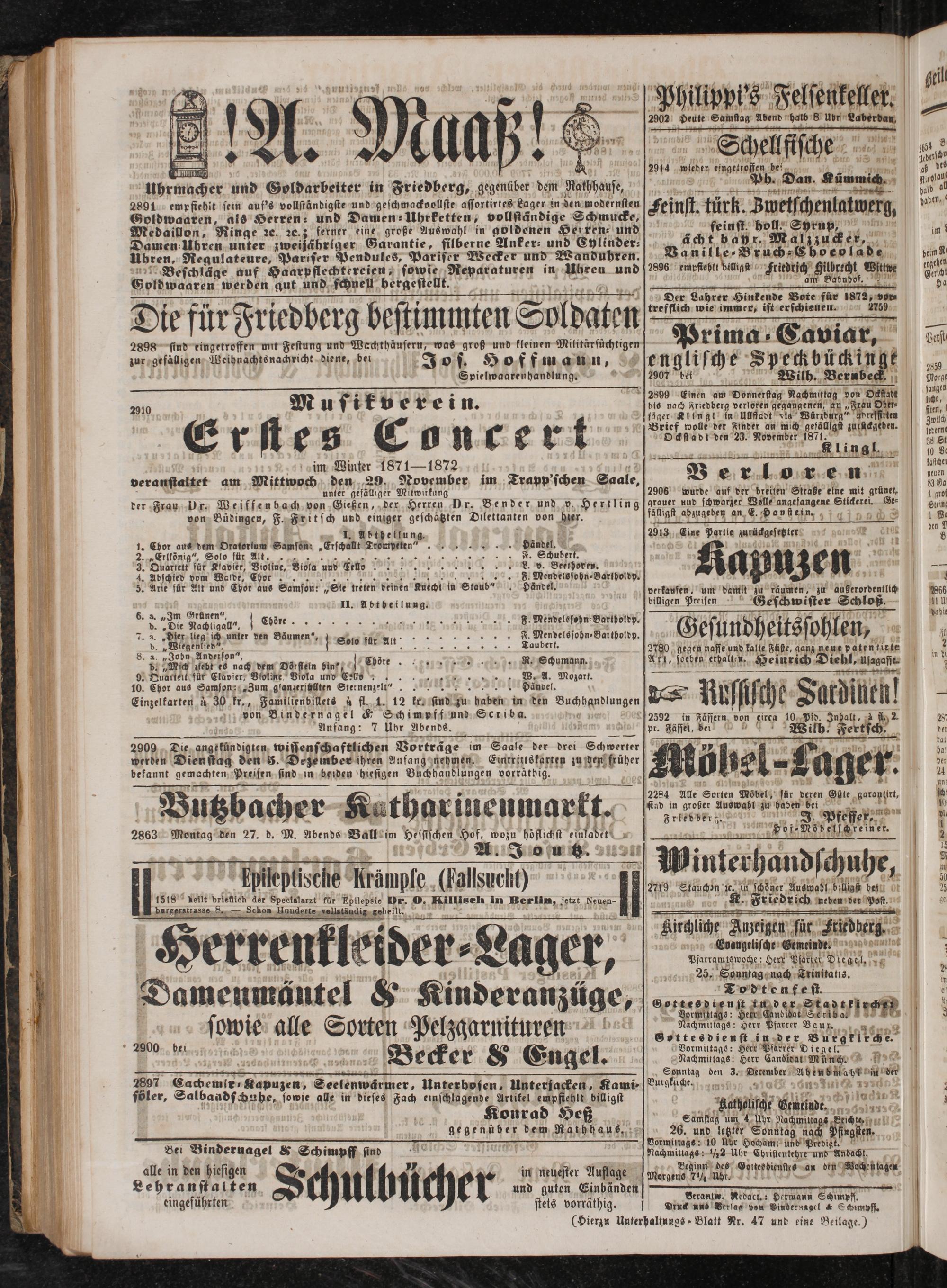 im Winter 1871—1872 veranstaltet am Mittwoch den 29. November im Trapp'schen Saale, unter gefälliger Mitwirkung der Frau Dr. Weiffenbach von Gießen, der Herren Dr. Bender und v. Hertling von Büdingen, F. Fritsch und einiger geschätzten Dünen von hier.