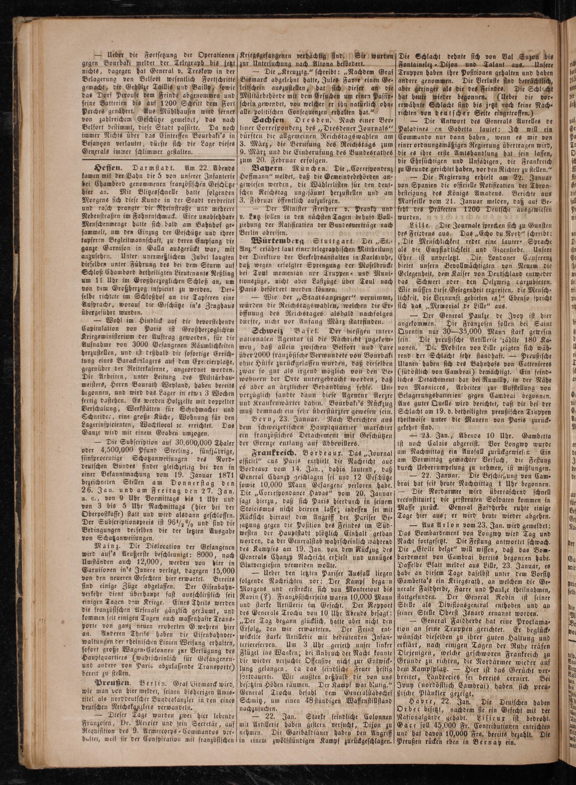 — 23. Jan., Abends 10 Uhr. Gambetta ist nach Calais abgereist. Vor Longwy wufde am Nachmittag ein Ausfall zurückgewiesen. Ein am Vormittag gemachter Versuch, die Festung durch Ueberrumpelung zu nehmen, ist mißlungen.