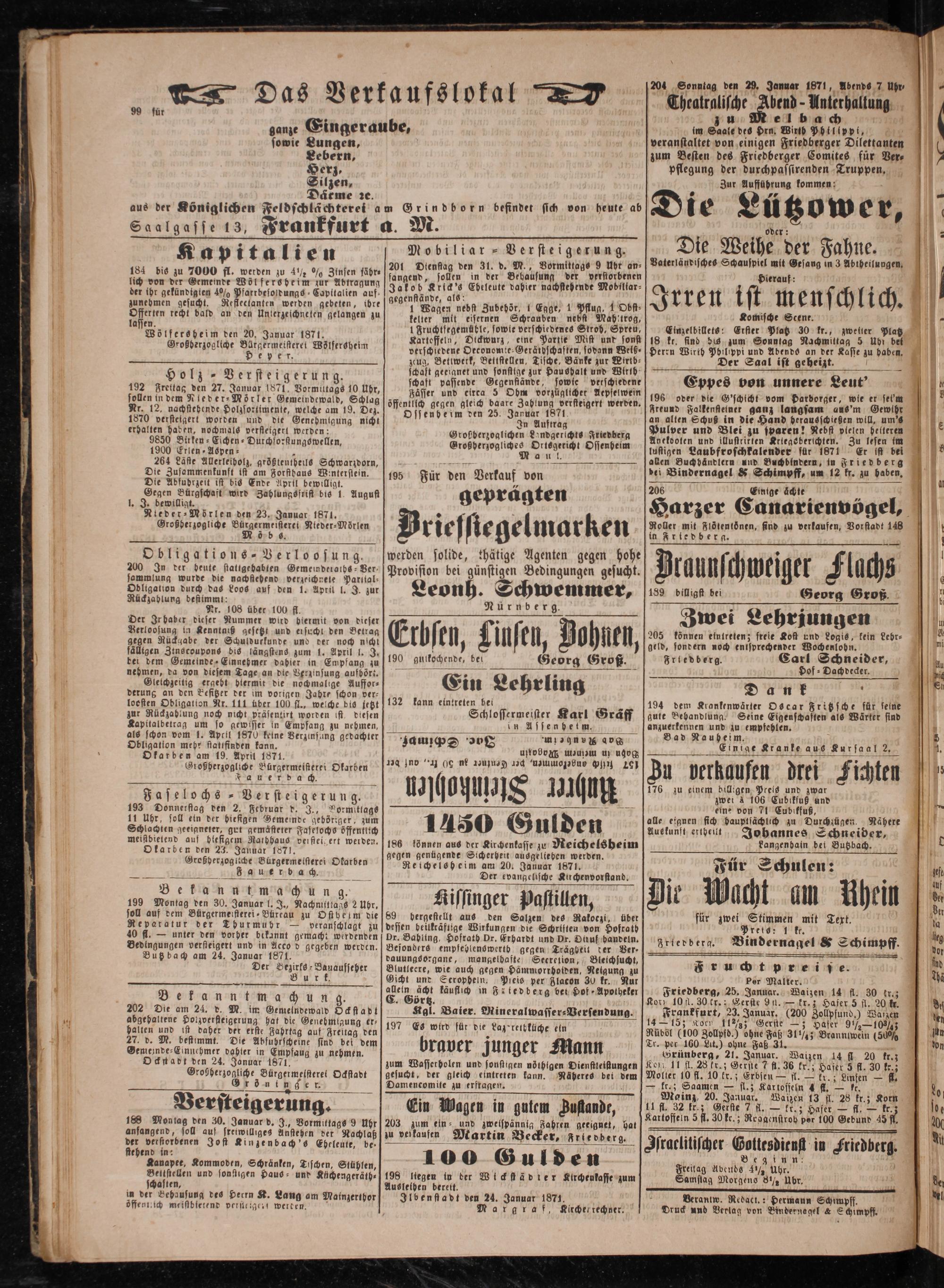 im Saale des Dru, Wirth Phillppi, 812 veranstaltet von einigen Friedberger Dilettanten zum Besten des Friedberger Comites für Ver⸗ pflegung der durchpassirenden Truppen. Zur Aufführung kommen: 1
