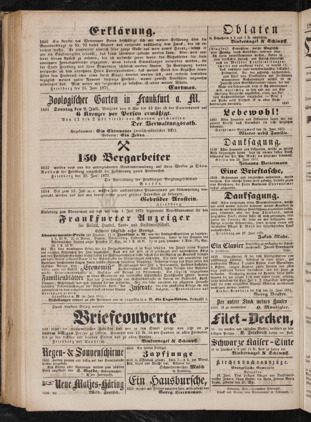 2 Friedberg. Einladung zum Abonnement auf das mit dem 1. Juli 1871 beginnende Neu⸗Abonnement für den Frankfurter Anzeiger für Politik, Handel, Land- und Volkswirthschaft.